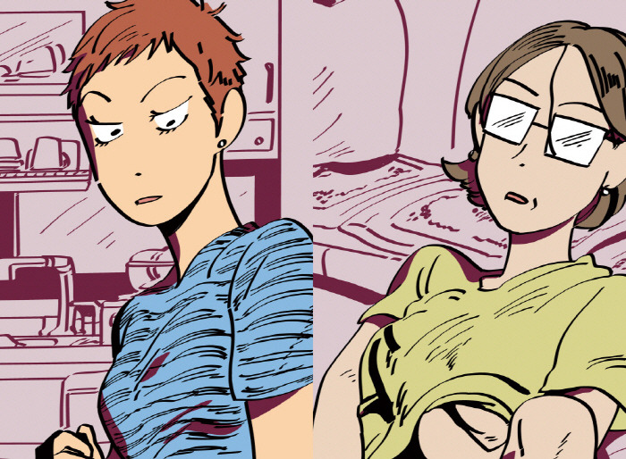 하지만 웹툰 <남남>에서는 캐릭터 간의 관계성이 정반대이다. 가족 구성원끼리는 무의식적 믿음이 결여된 남남이고, 닮은 구석이라고는 하나 없는 남, 남에 위치한 이들은 오히려 가족 같다. 그들은 애쓰지 않는다. 누구를 이해하기 위해, 이해받기 위해 지지고 볶지 않는다. 드라마 장르의 일상을 다룬 생활 웹툰이라 생각하기 쉽지만, 여타 드라마 장르에서 흔히 다뤄지는 관계성과는 사뭇 다르다.
