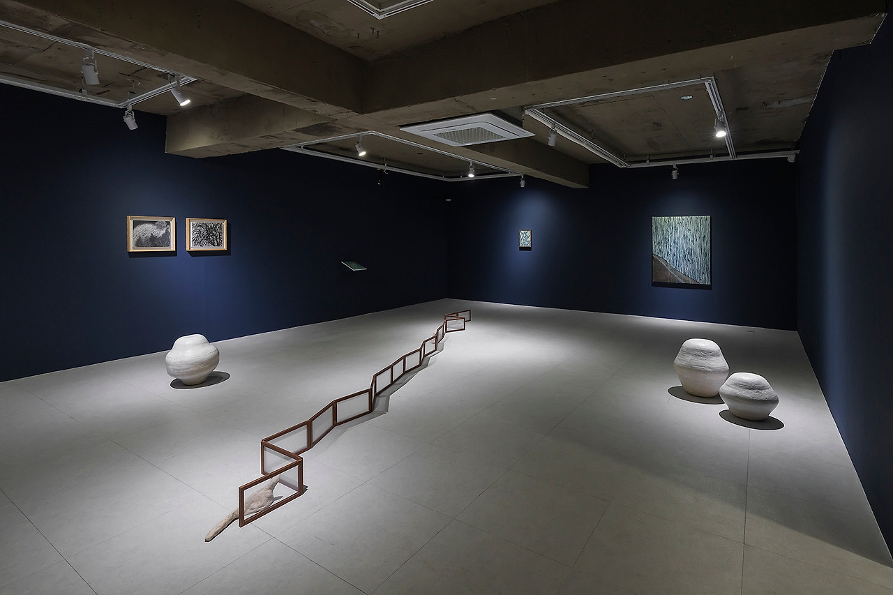 예열을 마치게 해 준 가장 중요했던 작품은 한진 작가의 작품이었다. 지하 1층에 위치한 <저만치 벽> 연작과 <밤결 속에 머물다> 연작은 서문에서 언급했던 것처럼 감각과 사유의 시간을 유효하게 해주었다. 나도 모르게 오랜 시간 작품 앞에 머물렀다. 평면회화 앞에서 무언가를 느낀 건 오랜만이었다. 딱히 뚜렷한 형상과 구상은 없었다. 다만 반복되는 무언가가 그림에 드러났고, 그림 뒤에 숨겨진 갖가지 사유의 레이어들이 숙성된 채 내 앞에 다가왔다. 팸플릿의 설명을 들으니 더 좋았다.