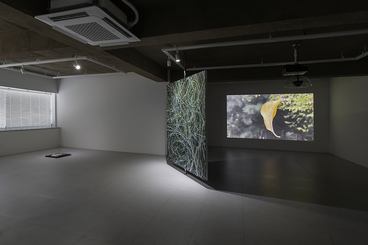 땅바닥에 엉덩이를 대고 영상을 한참을 올려다봤다. 순간 이게 실제로 내 눈앞에 벌어졌으면 하는 소망이 들었다. 거미줄에 매달린 흔들리는 낙엽, 이파리에 맺힌 물방울, 땅에 떨어지는 열매 등이 영상에 담겨있었다. 이런 폐쇄된 곳이 아니고서야 우리는 이러한 미물의 순간에 오랜 시간을 들이지 않을 테니 말이다. 언뜻 보면 별거 아니어 보이는데, 툭하고 내놓는 한진 작가의 시선이 퍽 마음에 들었다.