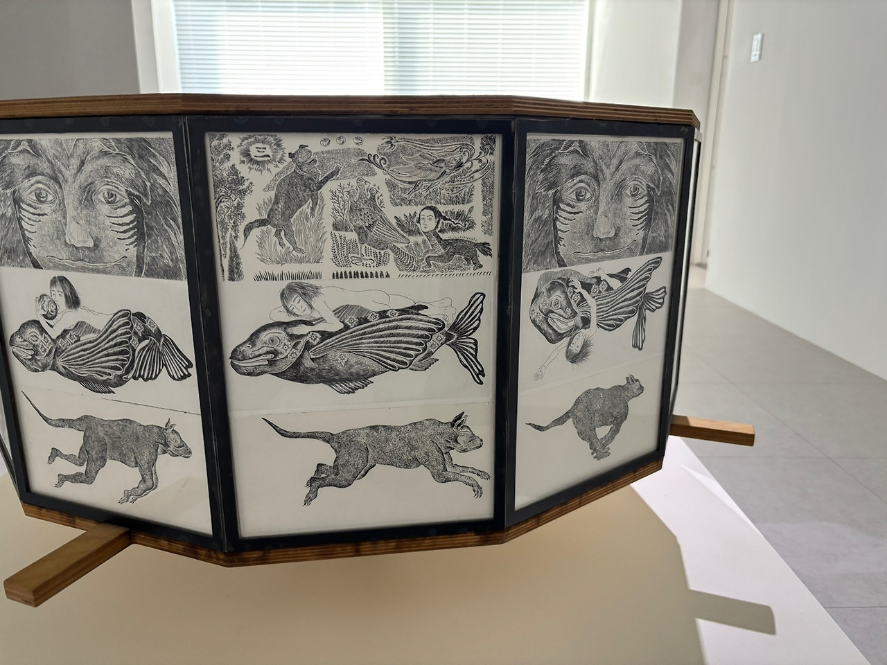 반대편 공간으로 향했다. 매우 재미있는 작품이 있었다. 김도연 작가의 <감이야기>(2022). 순간 1층에서 봤던 알록달록한 작품과 같은 작가의 작품이라는 것을 생각지도 못했다. 물론 자세히 보면 필체나 그림의 모양새(?)가 닮아있다는 사실을 알 수 있지만, 색감이 없으니 전혀 다른 느낌으로 다가왔다. 특히 조이트로프 방식으로 설치된 작품과 김도연 작가의 그림이 잘 어울린다는 생각도 들었다. 할아버지 댁이라는 특정 장소에서 출발한 작가 개인의 기억과 동아시아 신화 인물을 결합한 그림은 마치 할아버지 할머니가 손자에게 들려주는 동화 같았다. 개인적으로 그림 속 이야기가 적힌 텍스트도 같이 곁들여 있어도 좋을 것 같았다.