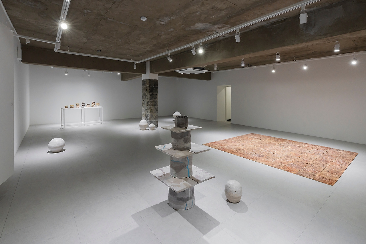한진 작가 작품 옆에 덩그러니 놓인 흙덩어리의 존재도 문득 궁금해졌다. 공간이 좁아 마치 발에 챌 것 같이 놓인 흙덩어리가 나를 올려다보며, 제발 발로 치지 말아 달라고 애원을 하는 것 같았다. 그 존재의 시작을 어렵지 않게 발견할 수 있었다. 지하 1층 반대편의 공간에 친구들을 찾았기 때문이다. 문이삭 작가의 작품들이었다. 이상하게 문이삭 작가의 작품들은 아까 그 아이처럼 각자 자신들만의 이야기를 지니고 있어 수다를 떠는 것 같은 착각이 들었다. 올록볼록한 친구들은 살아있었다! 인공적인 작품이 아니고 자연에서 수집한 친구들이어서 그랬을까? 그중 눈에 띄는 작품은 마치 다보탑처럼 생긴 작품이었다. <무제(Between Father and Child)>(2021). '산에서 노는 딸아이의 움직임을 수직성으로, 밭일하는 부모의 움직임을 수평성으로 표현하며 자연과 신체의 근원적 관계를 탐구한다'라고 적혀 있었다. 딸아이와 부모를 향한 따뜻한 시선이 담겨 있어 그런가 투박한 외연과는 별개로 따뜻함이 느껴졌다.