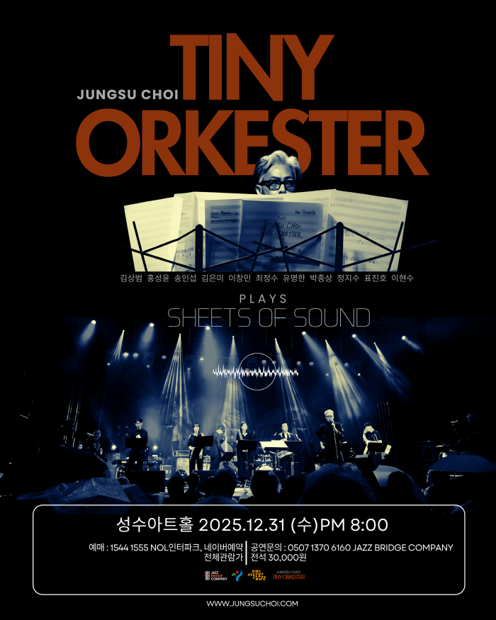 사실 '재즈'하면 떠오르는 이미지는 어두운 바에서 재즈 보컬이 그르부 한 노래를 부르고 콘트라베이스, 피아노, 드럼 연주자가 서로 시선을 주고받는 그림이다. 하지만 이번에 관람한 공연의 모습은 사뭇 달랐다. 클래식 공연처럼 관객을 등진 지휘자가 있었고 열 명의 연주자가 관객을 향해 악보를 두고 있었다. 마치 오케스트라처럼 말이다. 작곡가 최정수를 중심으로 한 최정수 타이니 오케스터(JTO)의 공연. <Plays Sheets of sound>였다.