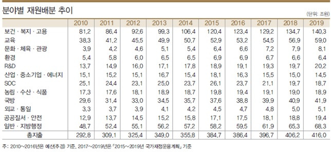 정황을 짚어보면 이렇다. 대한민국 전체 살림살이에서 문화체육예산은 대통령의 문화예산 2% 확보 공약에 탄력받아 최근 급속히 증가했다. 2011년 4조2000억원의 예산이 2016년에는 6조6000억원까지 치솟았다. 보건·복지·고용, 환경, R&D 등 충분히 미래 가치 지향적인 예산 투입처가 많은데도 문화체육예산은 눈에 띄게 상승 곡선을 그렸다.