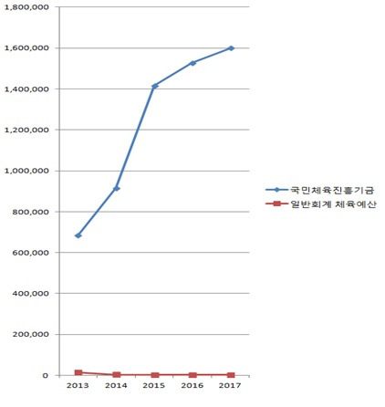 여기서 맹점은 문화체육부가 관리하는 체육예산이 정부관리 기금이 아닌 공공기관 관리기금에 집중돼 있다는 점이다. 특히 최근 국민체육진흥기금의 예산 증가폭이 가팔랐다. 이 기금은 2015년부터 급격하게 증가했는데 김종 전 차관이 최순실 예산을 본격적으로 세팅하기 시작한 시점과 맞물린다.