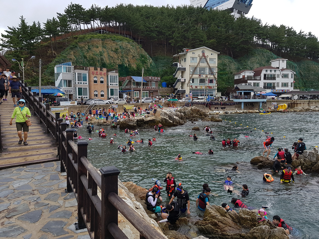 주차장에 차를 세우고 500m 정도 들어가야 했다. 여기서부터 장호항이 내가 생각했던 것만큼 넓은 곳이 아니란 걸 유추했다. 차를 주차 안내 요원에 따라 한쪽에 세우고 쭉 걸어 들어갔다. 그리 넓지 않은 좁은 길 양쪽에서 상인들이 각종 군것질거리와 스노클링 장비를 팔았다. 수영복을 입고 홀딱 젖은 채로 반대편에서 이쪽으로 나오는 사람들도 있었다. 다만 그 수가 많지는 않았다.