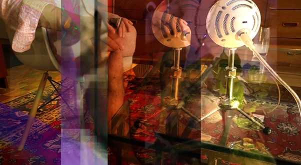 [그림4] 깨진 TV 화면처럼 화면이 가로로 삼등분되어 색과 사물들이 흔들려 보인다. 바지를 벗은 한 남자가 의자에 앉아있는 모습이 보인다. 그림 설명 끝.