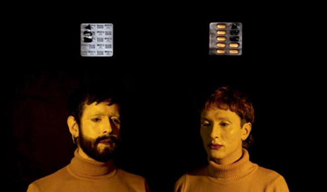 [그림2] 노란 스웨터를 입고 피부를 노랗게 칠한 남자 두 명이 서있다. 그 둘의 머리 위에는 한 캡슐씩 들어있는 노란색 알약들이 들있다. 그림 설명 끝.