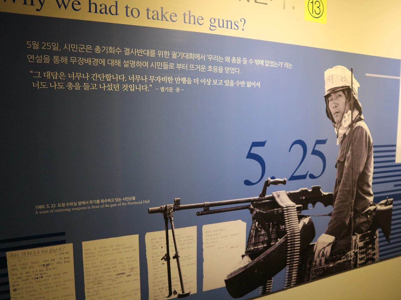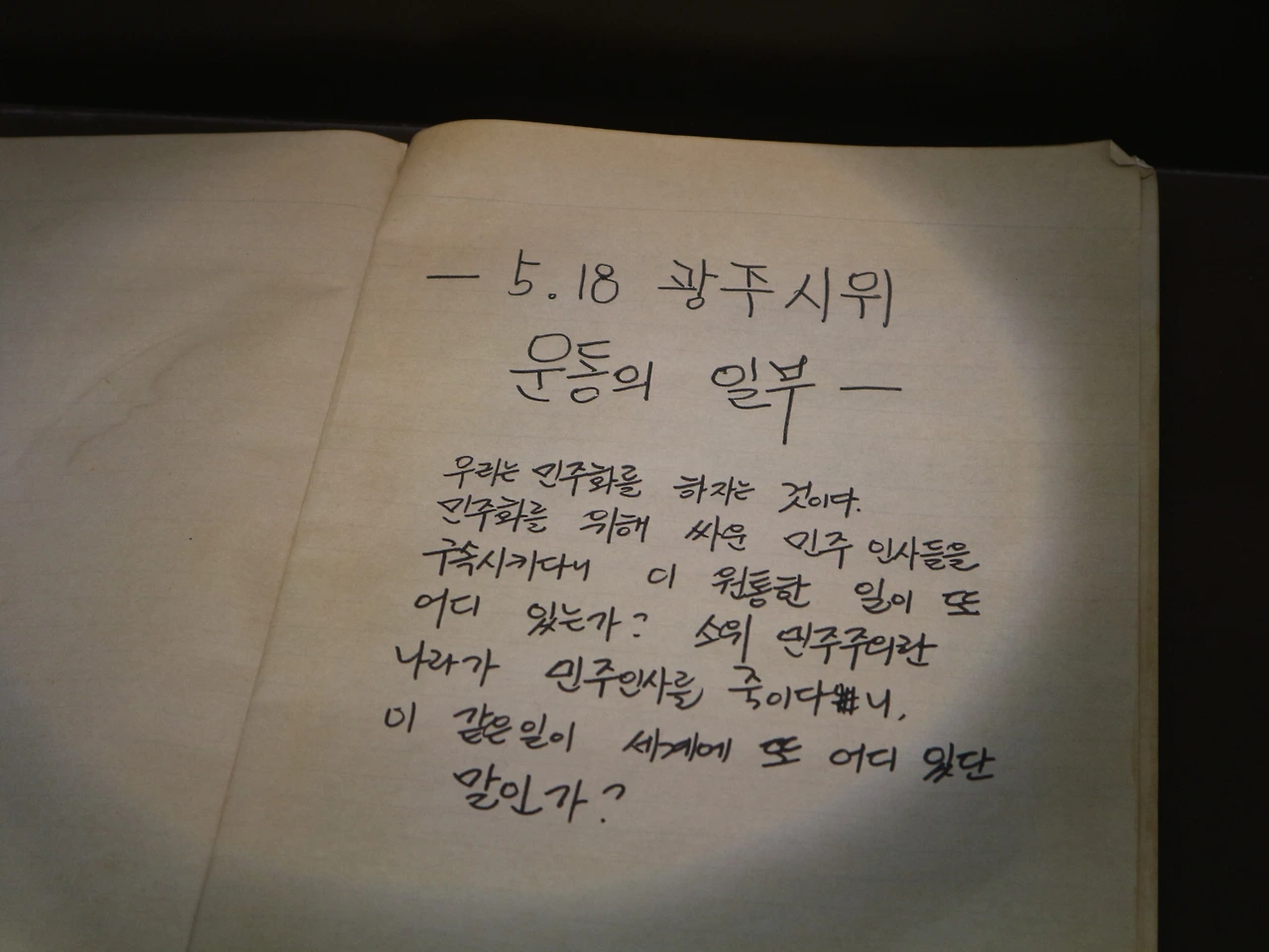 그렇게 나는 조금 더 비장해진 마음으로 2층을 향해 올라갔다. 이곳에는 6학년 어린아이의 일기부터 기자들의 취재 수첩, 결의문과 신문까지 수많은 기록이 전시되어 있다. 총을 들지 않는다고 투쟁이 멈추는 것은 아니다. 이제 투쟁은 ‘기록’으로 확장되고, 이는 다시 ‘기억’으로 이어진다. 각자의 글마다 형식과 목적이 달랐지만, 그들은 모두 한 가지를 담고 있었다. 그것은 ‘간절함’이었다. 우리의 비극을 알리고 싶다는 하나의 열망으로 모인 그 글들은 지금까지 남아 우리를 5.18의 기억으로 초대한다.