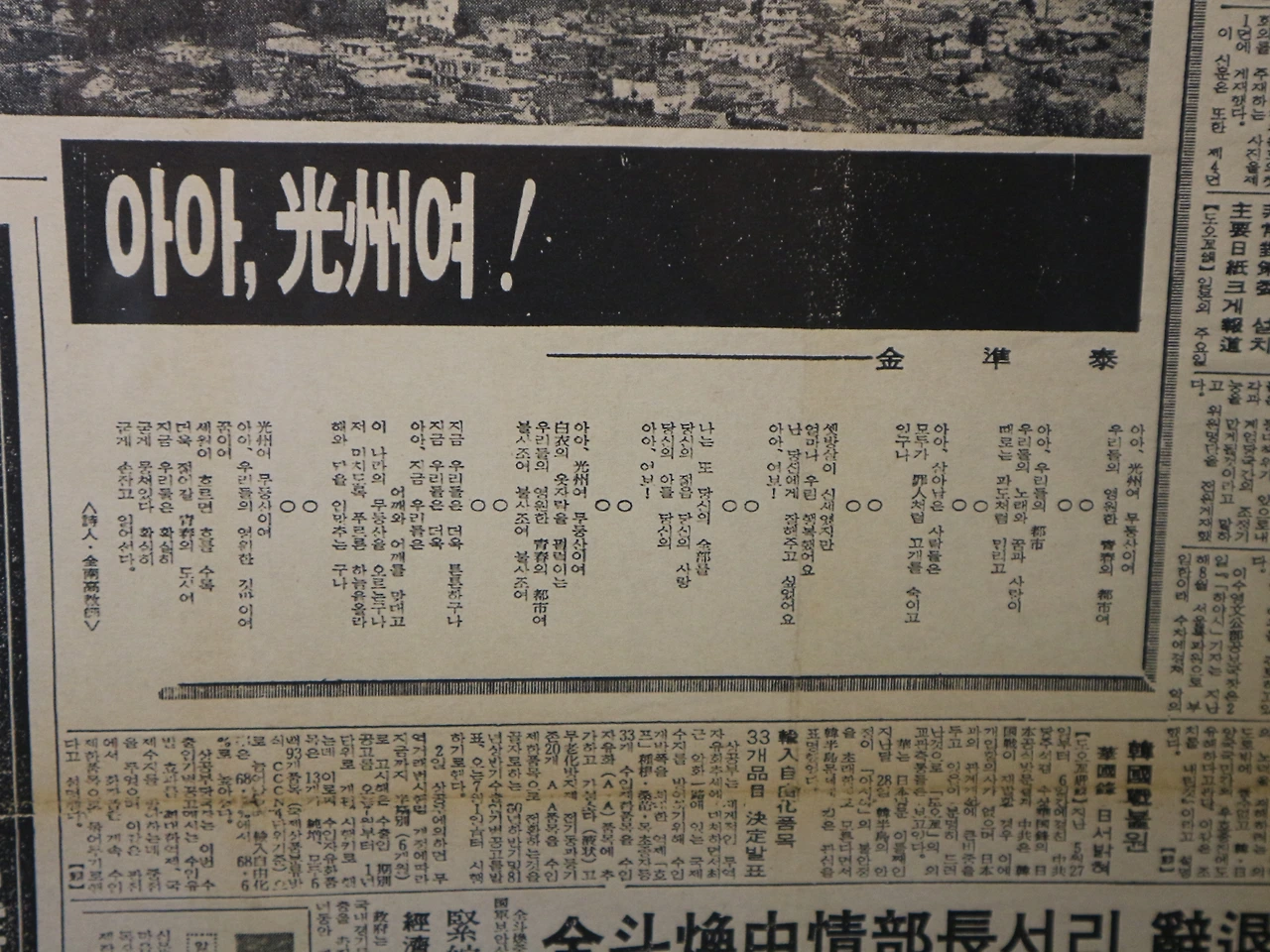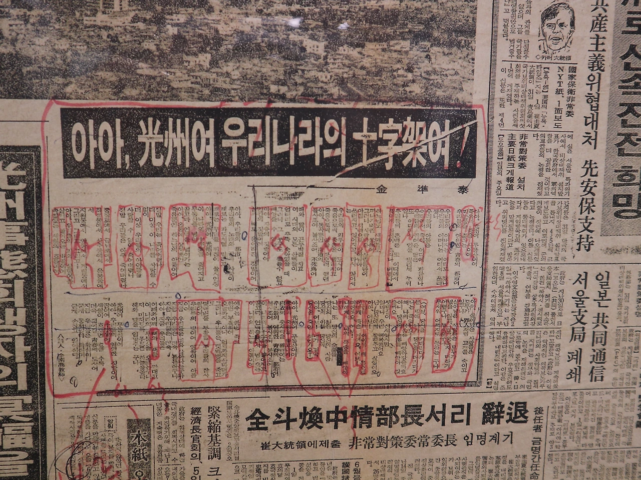 하지만 기억을 향한 국가의 억압 역시 집요했다. 시민군이 마주한 절망이 계엄군의 총칼이었다면, 기록과 기억이 마주한 것은 검열이었다. 1980년 6월 2일 전남매일신문 1면에 실린 〈아아, 광주여 우리나라의 십자가여〉라는 긴 시는 누군가의 빨간 사인펜에 의해 깨끗이 표백되어 「아아, 광주여」라는 제목으로 실려야 했다. 그리고 그 펜은 계속해서 “아아, 광주여 무등산이여 죽음과 죽음 사이에 피눈물을 흘리는 우리들의 영원한 청춘의 도시여”에서 “죽음과 죽음 사이에 피눈물을 흘리는”을 지웠다. 그렇게 광주의 죽음과 피눈물 역시도 지워져 갔다. 그때 시인과 광주 시민이 느꼈을 상실감과 분노는 어느 정도였을까.