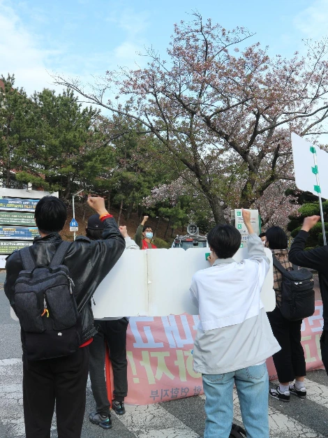 신라대학교 캠퍼스에는 넓은 입구를 따라 벚꽃들이 살짝 비에 젖은 채로 피어 있었다. 벚꽃 쪽으로 눈이 가던 것도 잠시, 현수막들이 등장했다. "신라대는 청소노동자를 직접 고용하라!", "신라대 청소노동자 집단해고 철회투쟁을 적극 지지합니다!", 그리고 또 "청소노동자 생존권 유린하는 신라대를 규탄한다!"라며 굵은 글씨로 고요히 외치며. 그다음 이어진 장면은 빈 페트병을 양손에 들고, 우리를 향한 환영의 의미로 한껏 두드려 주시는 노동자분들의 모습이었다. 황송함에, 아무것도 아닌 내가 이런 환대를 받아도 되나 하는 마음에 한껏 흔들리며 차에서 내렸다.