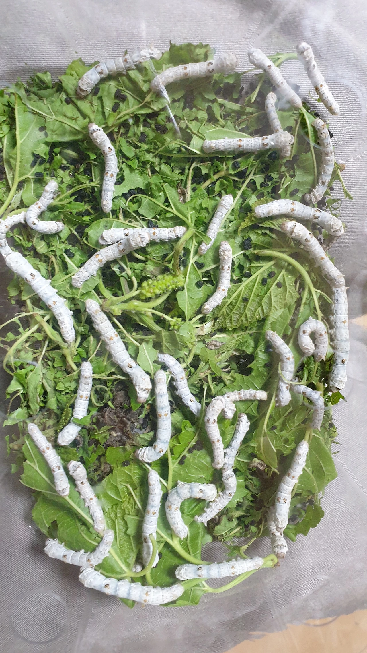 뽕잎을 먹고 있는 누에다. 사람으로 치면 유아기인 애벌레 시기. 얼마 후에 사춘기인 번데기가 될 것이다.