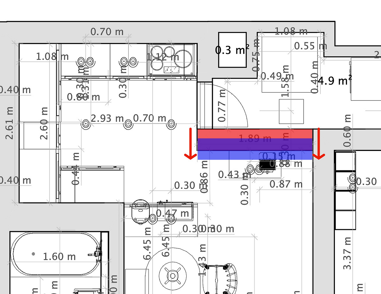 목작업이 다 끝나고 다시 실측을 받으면 되긴 하지만 이케아 실측 서비스를 받는데만 12만 원이 든다. 첫 번째 실측 때만 (최종 설치 시) 12만 원을 기프트카드로 다시 돌려주지, 두 번째부터는 돌려받을 수 없다. 게다가 실측 서비스 예약도 밀려있는 상황이라 자칫 시공 일정이 뒤로 밀려버릴 수도 있어서 어쩔 수 없이 주방 설계도면을 1차로 정하고, 목공이 다 끝났을 때 내가 직접 실측한 후 그 규격을 바탕으로 최종 도면을 정하기로 했다. 조금이라도 오차가 생기면 주방 설치가 안될 수도 있었기 때문에 주방 작업 시에는 목수와 계속 더블체크를 하며 점검했다.