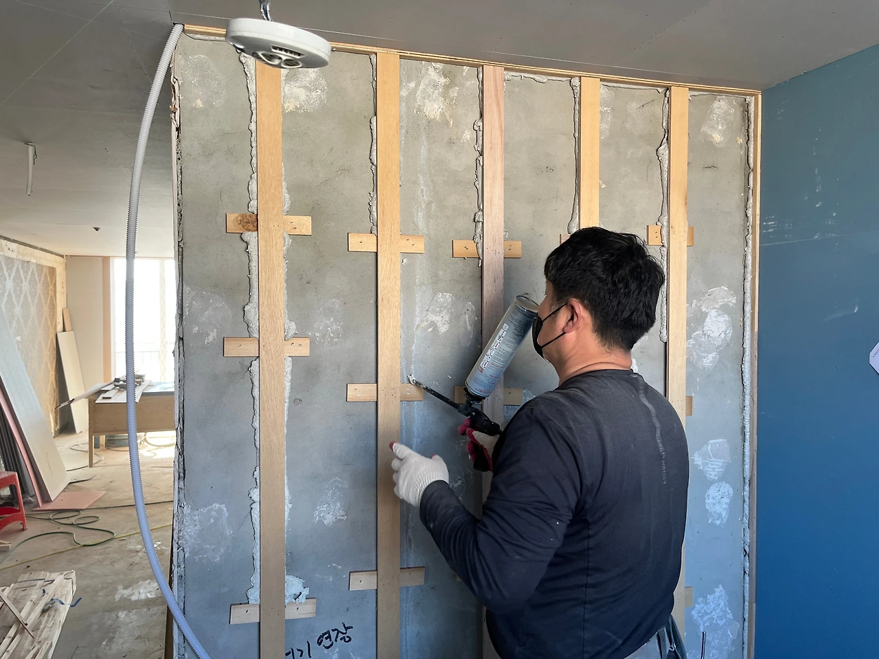 이렇게 단열과 벽면 석고보드를 했다면 또 신경 써줘야 되는 것이 상부장 설치를 위한 보강목 설치다. 무거운 그릇 같은 것들이 많이 수납하는 상부장의 경우 바닥에 있는 수납장과 달리 공중에 매달려 있기 때문에 벽에 튼튼하게 고정되어 있어야 한다. 만일 그렇지 않다면 상부장이 떨어져서 안전사고의 위험이 있다. 우리가 할 건 어느 위치에 상부장이 설치될 거라고 목수분에게 이야기를 하면 된다. 나 같은 경우 이케아 주방의 설치 도면이 있었기 때문에 상부장의 크기와 높이가 나와 있었다. 그리고 다행스럽게도 현장에서 목수 사장님과 이케아 실측 기사님이 만난 적이 있었는데 그때 내가 상부장 보강목은 어떻게 하면 되는지 이야기만 하니까 서로 요청사항을 주고받고 정확하게 지시할 수 있었다. 여기서 중요한 것은 셀프 인테리어를 하는 내가 정확하게 어떤 것을 해야 하는지 알아야 지시할 수 있다는 것이다.