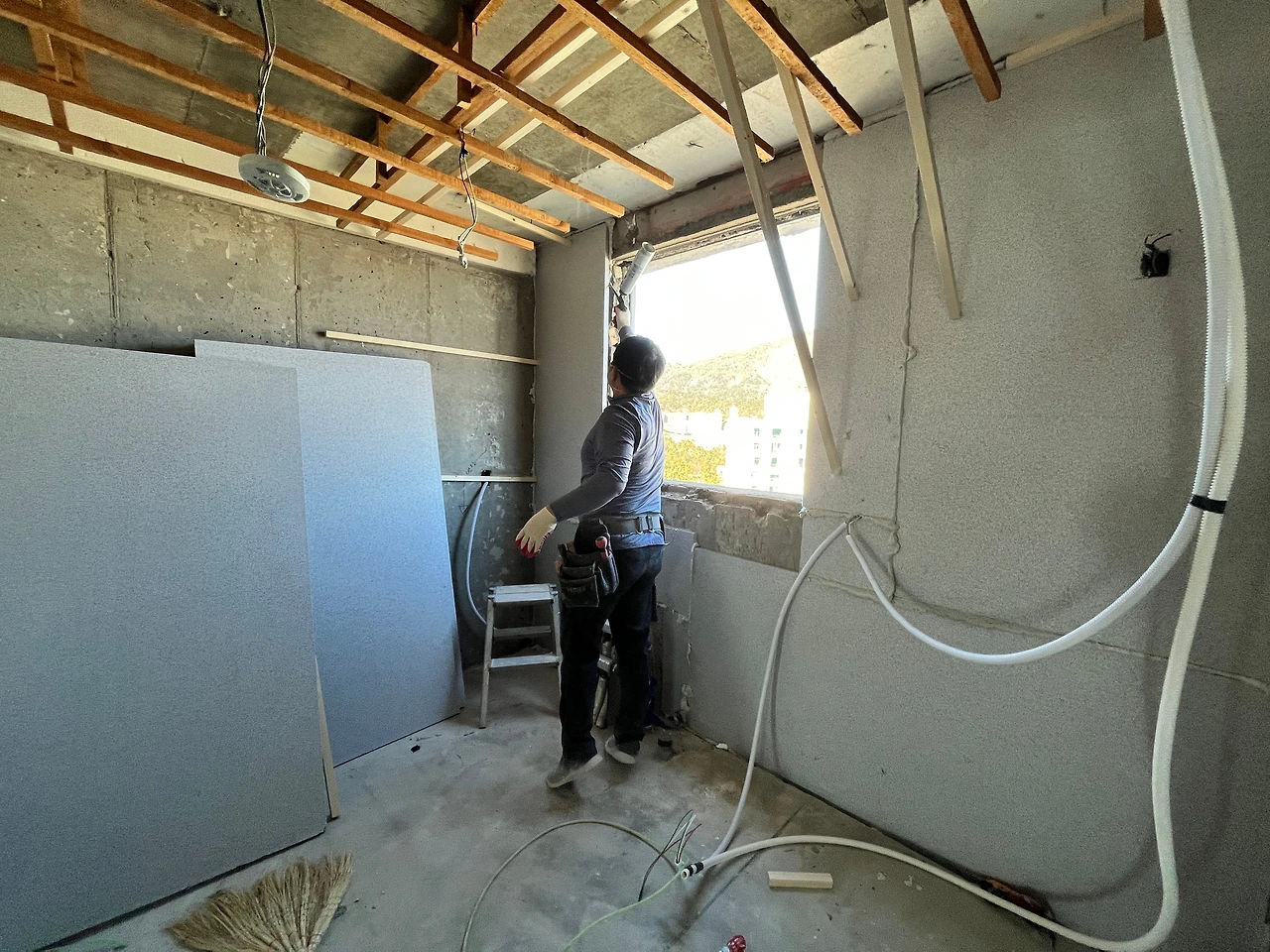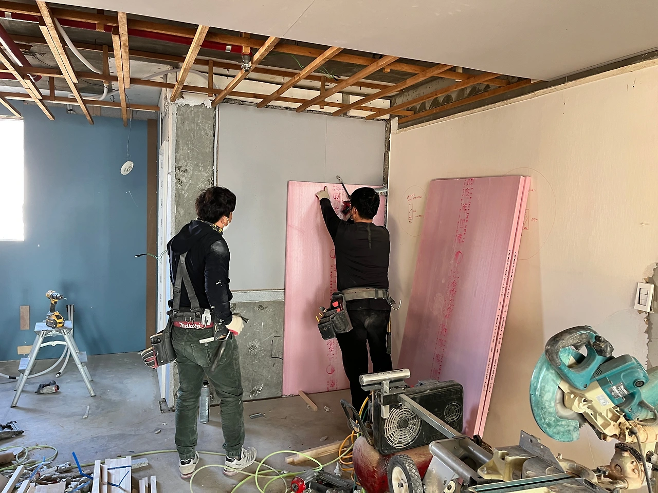 주방 철거할 때 외부와 맞닿아 있는 석고 보드를 철거했다면 벽에 단열 작업도 다시 해줘야 한다. 단열재는 두꺼우면 두꺼울수록 좋지만 우리 현장은 주방의 면적이 정해져 있었기 때문에 두꺼운 단열재는 넣지는 못하고 아이소핑크(10T)와 방수 석고보드로 단열 시공을 진행해 주었다. 그리고 주방 벽뿐만 아니라 외부의 냉기가 벽과 벽이 만나는 모서리 부분까지 타고 들어오기 때문에 맞닿은 모서리 부분까지 단열재를 시공해 주었다.