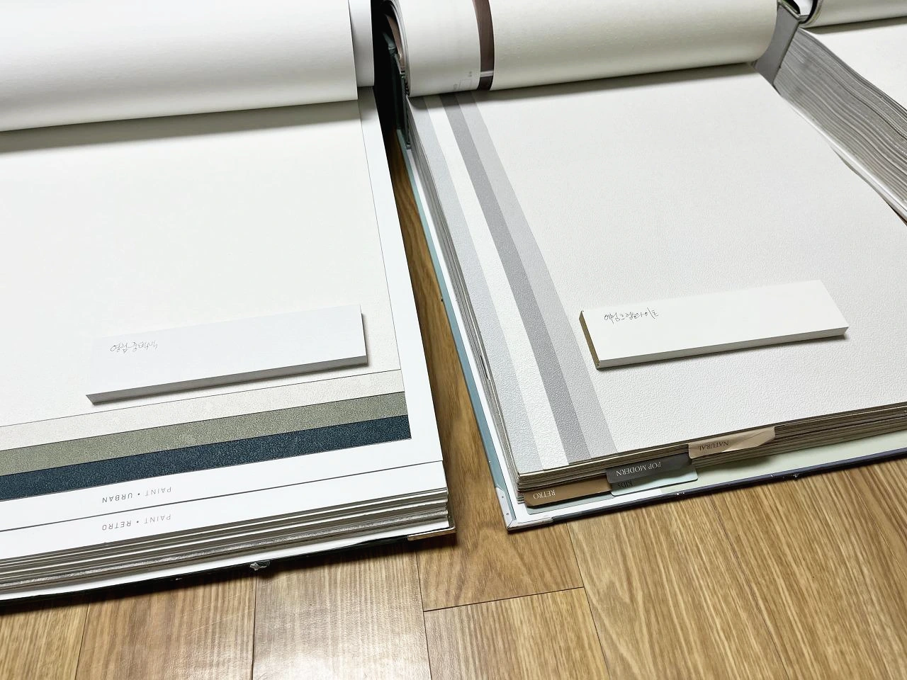 이렇게 실크벽지인지 합지벽지인지를 택하고 나면 벽지 제조사별 샘플북을 보면서 원하는 색상, 디자인을 고르면 된다. 제조사는 LG, 신한, 개나리, 제일벽지 등이 있다. 요즘 커뮤니티에서는 LG 디아망(모던 회벽), 개나리(스노우 화이트), 신한벽지(조용한 사색) 정도가 화이트 색상 벽지로 인기 있는 편이다.