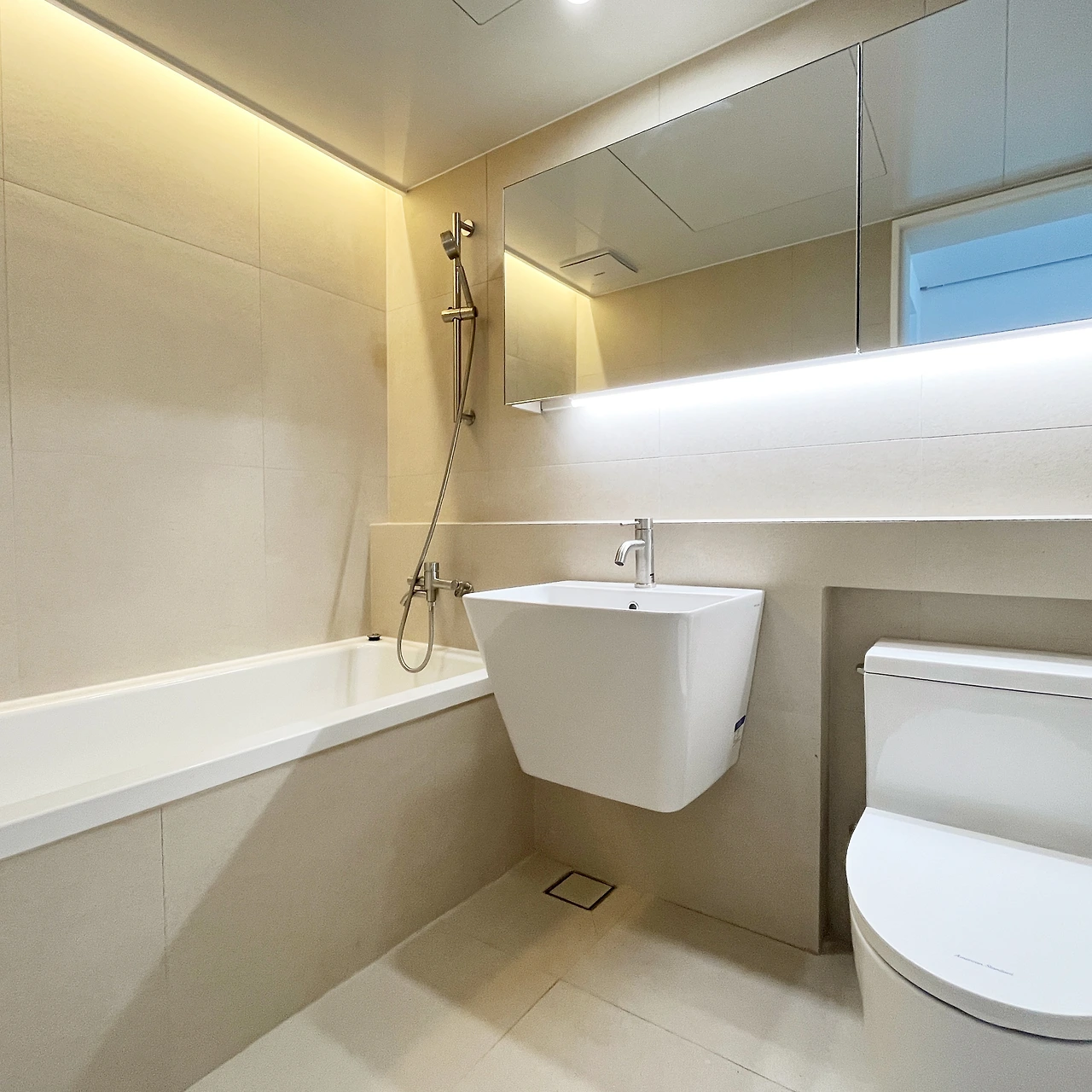 나도 욕실 두 곳 모두 이 방식으로 시공했다. 따뜻한 아이보리 컬러에 거친 질감을 가진 600각 포세린 타일을 욕실 바닥과 벽에 시공하고 동일한 톤의 아이보리 메지를 사용해 좁게 나온 구축 아파트 욕실을 최대한 넓어 보일 수 있게 했다. 나중에 욕실 시공 편에서도 설명하겠지만, 호텔 욕실 같은 완성도 높은 공간을 만들기 위해 타일의 모서리를 45도 각도로 컷팅해 시공하는 졸리컷 시공을 했다. 비용은 예상보다 많이 들었지만 만족도는 최상이다. 우리 집 욕실에 들어서는 사람들마다 호텔에 온 것 같다는 이야기를 많이 한다. 메지 선이 줄어드니 청소하기도 쉽고, 대중목욕탕만큼 거친 타일의 표면 덕분에 아이가 맨발로 들어가도 쉽게 미끄러지지 않는다.