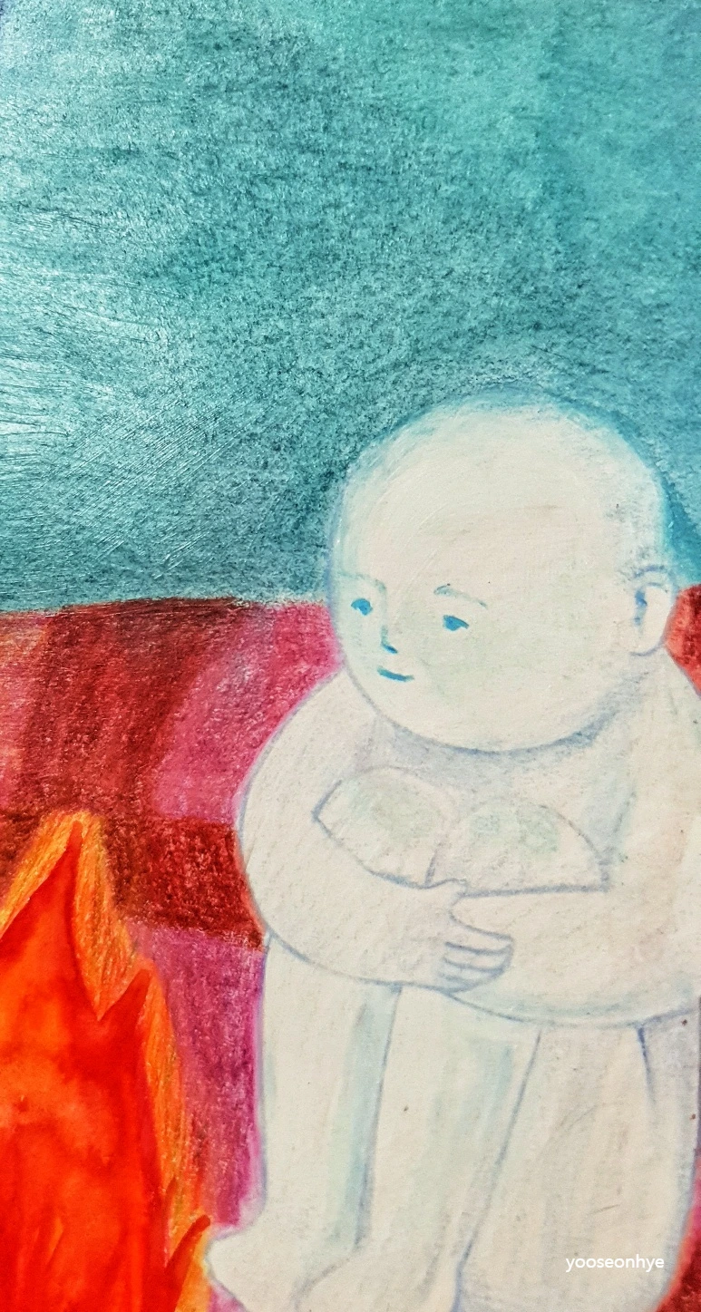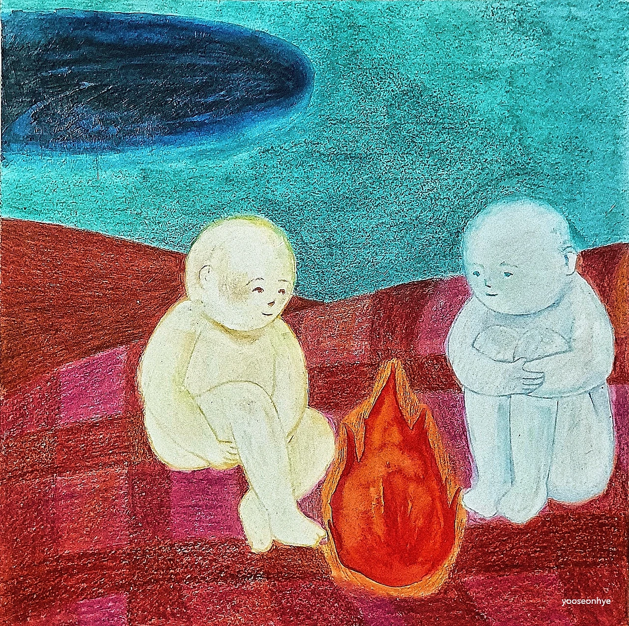 반딧불이를 닮은 꽃들의 밝은 빛을 따라 심연 밖으로 나온 B는 붉은 담요를 펼치고 있는 한 사람을 발견했다. 그 사람은 담요 위에 나무를 몇 개 올리고는 모닥불을 만들었다. 그 붉은 담요는 모닥불에도 신기하게도 단 한 줌도 타지 않았다. 그 사람은 B에게 다가와 아무 말 없이 그를 안아주고는 모닥불 앞에 앉기를 권했다. B가 모닥불 앞에 앉자 가까웠던 심연은 그들에게서 조금씩 멀어지기 시작했다.