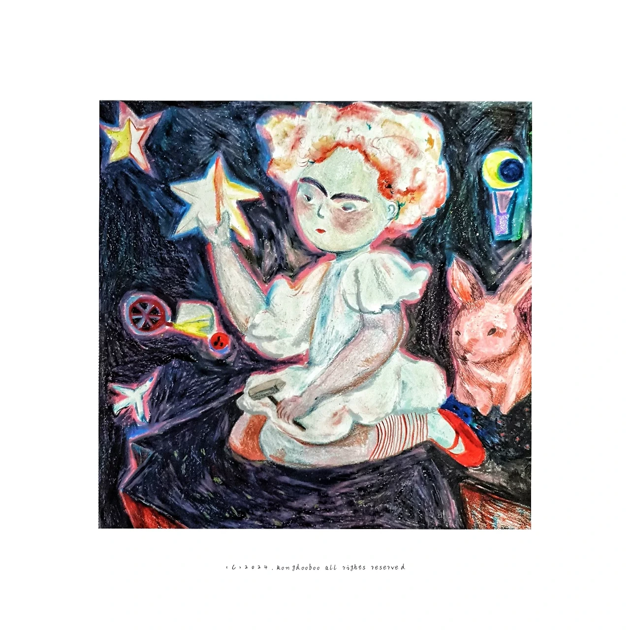 "내가 사는 곳에서는 별들이 쏟아지는 걸 보기 어렵단다. 한 자리에서 빛나는 별들은 늘 볼 수 있지만 쏟아지는 별들을 보는 걸 우리는 행운이라고 말하곤 해. 그러니까 이렇게 모아진 별 부스러기는 아주아주 크고 많은 행운이지!" 아이는 내가 있을 것 같은 곳을 바라보다가 맺힌 눈물을 세차게 닦고 내 손에 별 부스러기를 담아 주었습니다. 그리고 아이와 나는 검게 빛나는 하늘에 별부스러기를 후 하고 불었습니다. 그리고 아이가 키우는 달토끼와 함께 마구 흩어지는 별 부스러기들을 바라보았습니다.