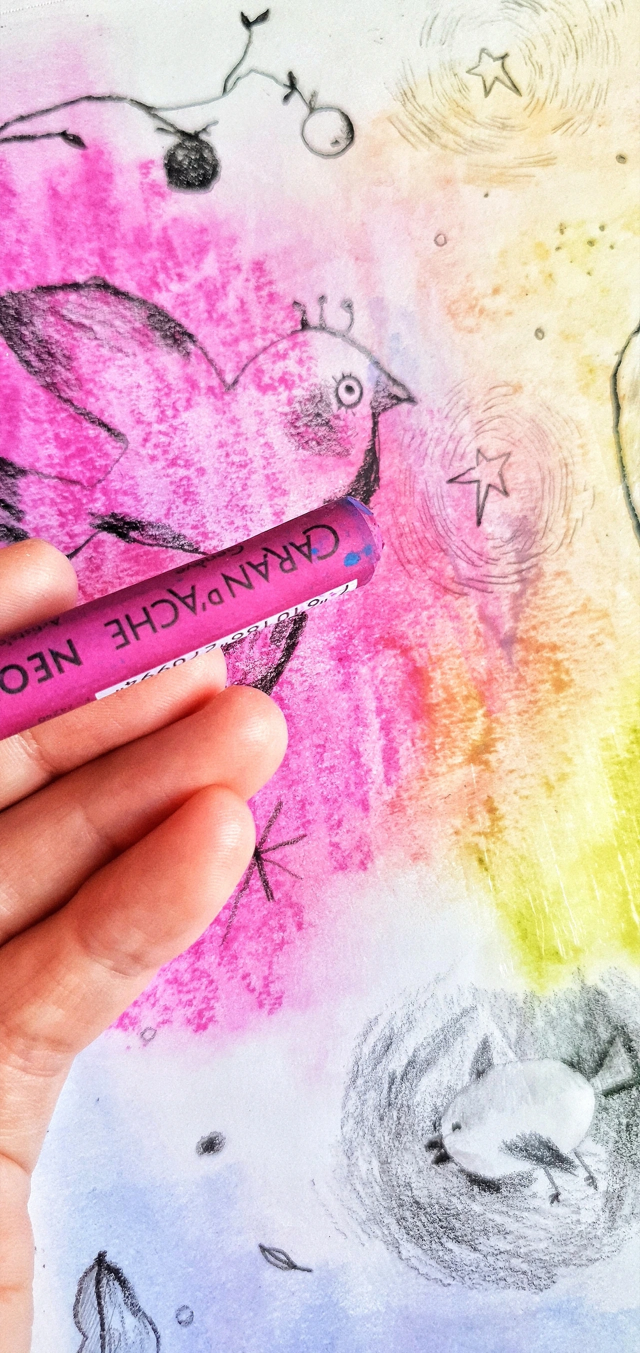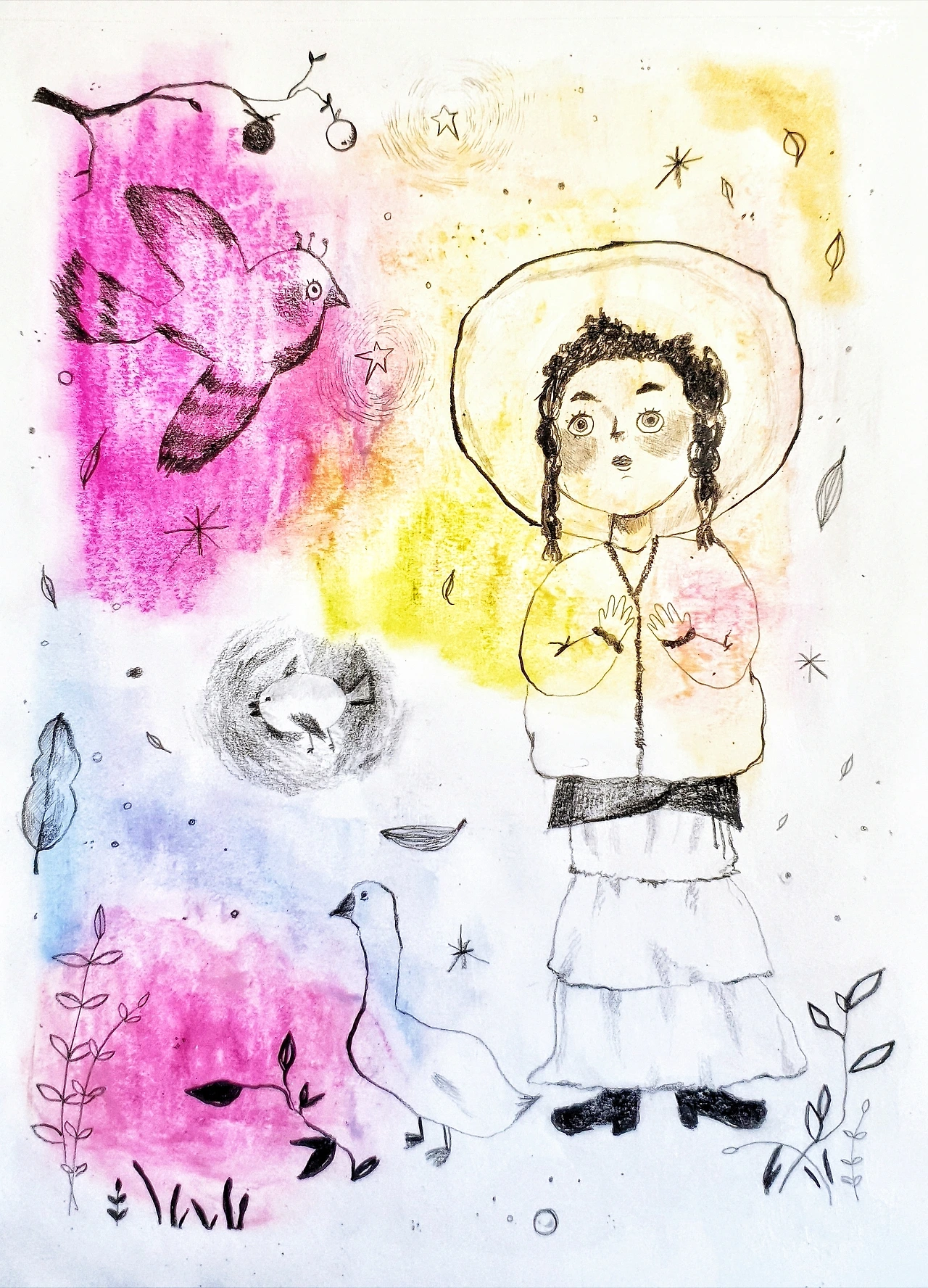 보랗고 노란 색종이로 접은 작은 별 같은 새들을