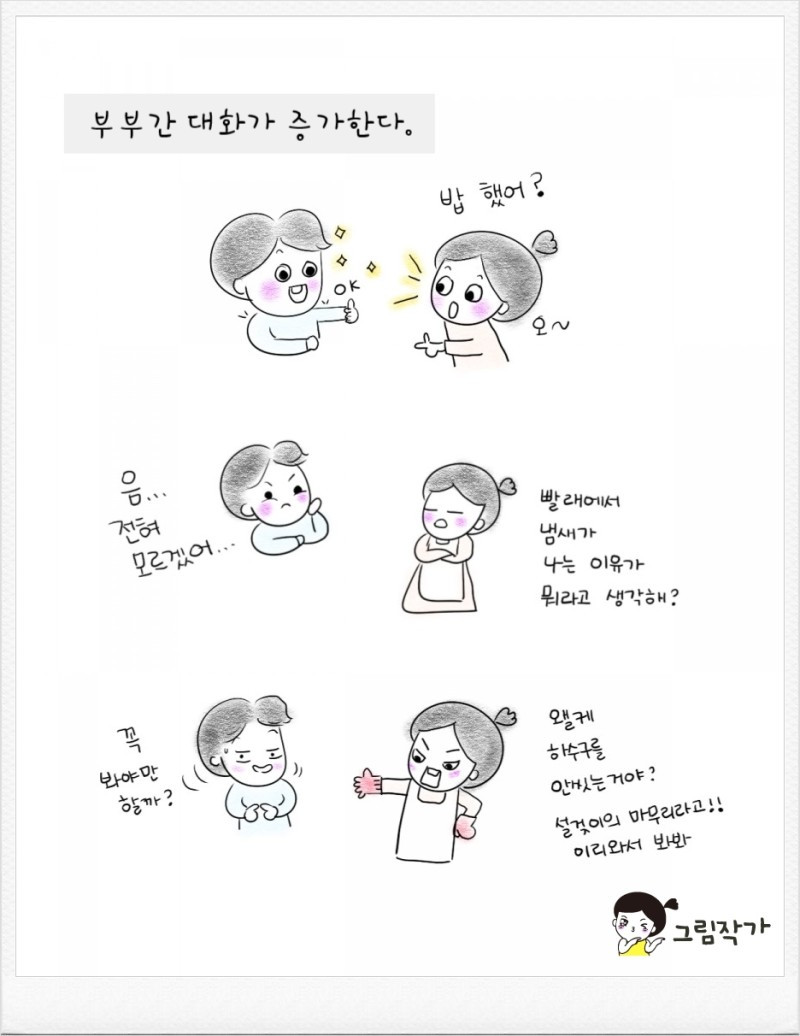 여전히 누나와 남동생의 옷을 바꿔 입히고 딸램의 머리를 삐죽삐죽 묶어주며, 요알못으로 먹던 반찬만 준다고 딸램의 잔소리를 듣고, 아들과 몸으로 놀아주느라 지치고, 설거지 이후에 가스렌지 한번을 닦을 줄 모르지만, 코로나로 인해 독박 육아를 하는 중이다. 요즘 젊은 부부들은 아빠가 육아휴직을 하는 경우가 예전에 비해 많아 졌다고 한다. 사회적인 분위기도 많이 바뀌어 가고 있는 듯 하다. 하지만 여전히 아이를 키우는 것은 온전히 부모의 몫으로만 남기에 쉽지는 않다는 생각이 들 때가 많다. 특히 요즘은 더욱..다들 어떻게들 버텨내시는지... 아빠의 육아휴직으로 생긴일은 육아휴직이 아니라도 코로나19로 부부가 함께 있는 시간이 길어지면서도 느끼는 것들이기도 할 것 같다. ㅋㅋ