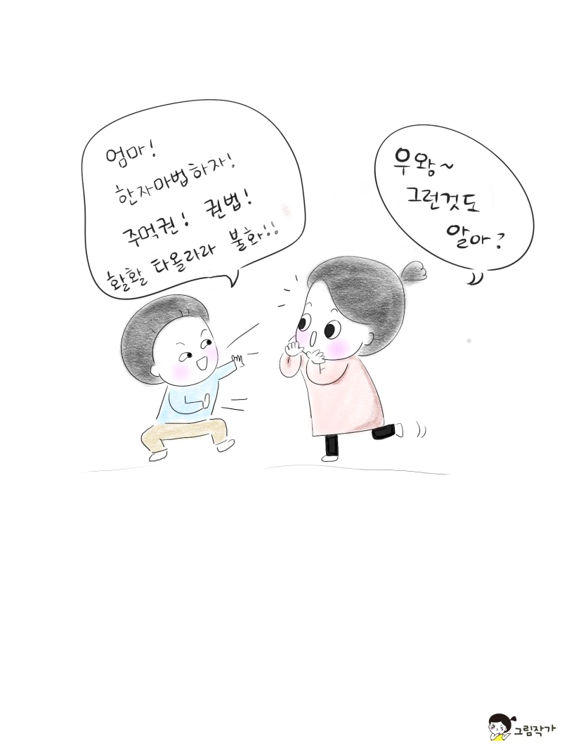 한글을 배우기 시작하면서 동화책을 읽다보면 만화책으로 넘어갈 때가 온다. 큰아이도 동화책을 열심히 읽다가 유치원즈음 친구들에게 마법 천자문이라는 만화책을 알고 와서는 사달라고 하기 시작했다. 다른 만화책에 비해 한자를 배운다길래 마법 천자문을 사주었는데 그냥 만화만 보았다. 그런데 한자는 읽을 줄 몰라도 국어에 있는 한자말을 이해하게 되어서 국어이해력이 높아졌다. 모르는 뜻의 한글을 유추하게 되는 거였다. 최근 다시 큰아이가 마법 천자문을 보기 시작했는데, 동생이 따라서 보기 시작했다. 그런데 만화책이라도 혼자서 읽기 좀 어려워하면서도 욕심을 내서 유튜브에서 찾아 만화로 보여주었다. 주인공 손오공이 도사님들과 옥황상제, 하늘나라 공주 샤오, 염라대왕등등의 도움을 받아 한자마법을 통해 (이를테면 "불화"를 외치면 불이 일어남) 공격을 하게 되어 세상을 지배하려는 대마왕의 수하인 혼세마왕과 대적하고, 대마왕의 부활을 막는 이야기이다. 둘째의 한글 이해력이 좀 부족하다 했는데 한자를 알고나니 조금 더 이해력이 생기는 것 같다. 물론' 자전거 자', '아파트 파' 하면서 폭소를 터트리게 하기도 하지만. ㅋㅋㅋ 요런 방법으로 한자이해도를 높일 수 있다니 좋은 세상이다.