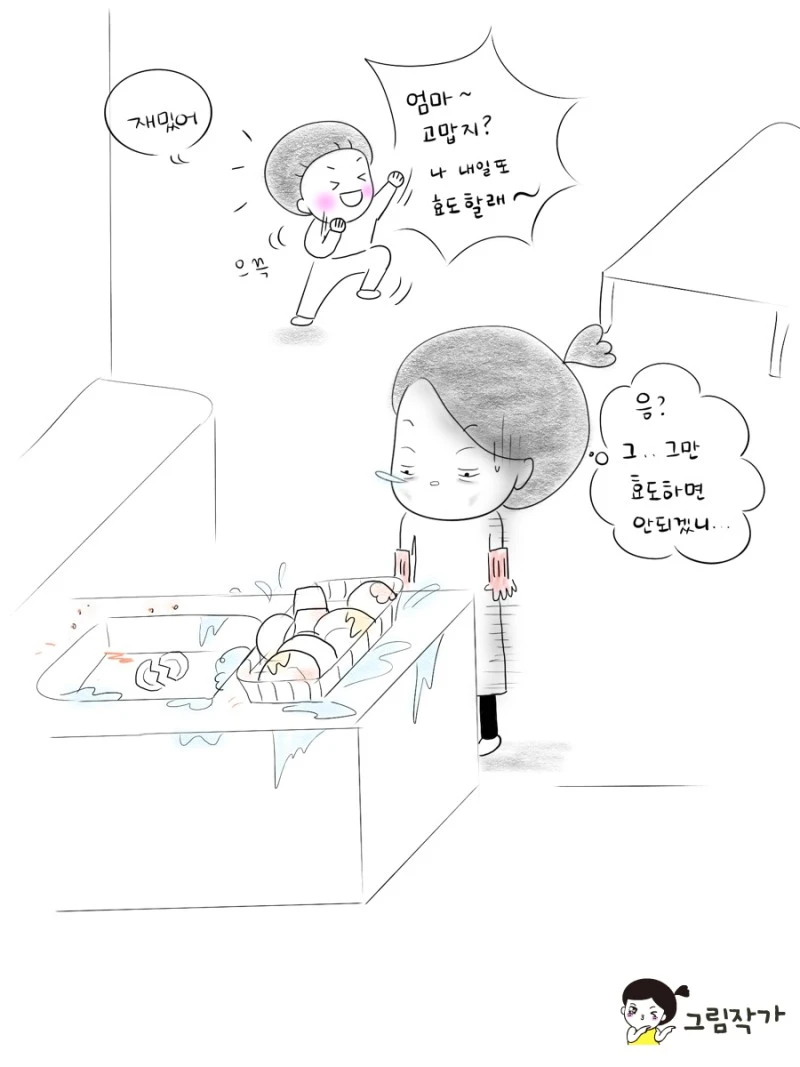 몸은 움직이고 싶은데 집에선 많이 움직일 수가 없고 코로나 때문에 특별활동도 못하고 놀이터도 제대로 못가니 많이 답답했아보다. 태권도를 다니면서 효도하겠습니다~ 수고하셨습니다~ 같은 말을 특유의 억양으로 배워온다. 너무 기특하고 귀여운데 역시나 효도가 무슨말인지 모르고 한거였다. ㅎ 설겆이를 도와준다며 일을 더 만들지만 효도한다고 칭찬해줬더니 뿌듯해하는 아들을 보니 일이 많아져도 효도의 기회를 많이 줘야 겠지?
