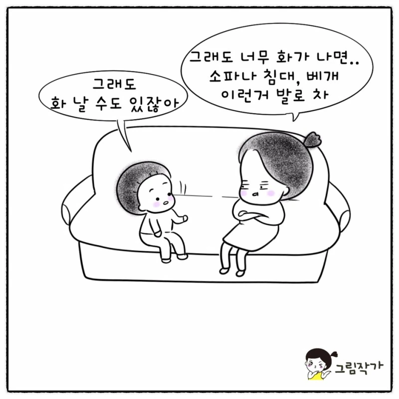 아들은 여전히 몸이 먼저 반응 하는 스타일이라 가지고 놀던 물건을 던지기에 야단을 치면서 스트레스 해소방법이라고 소파나 침대같은 다치치 않을 곳을 차는 것은 괜찮다고