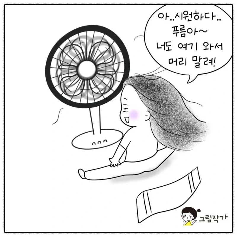 이제 막 더위가 느껴져 머리를 말릴 때 선풍기를