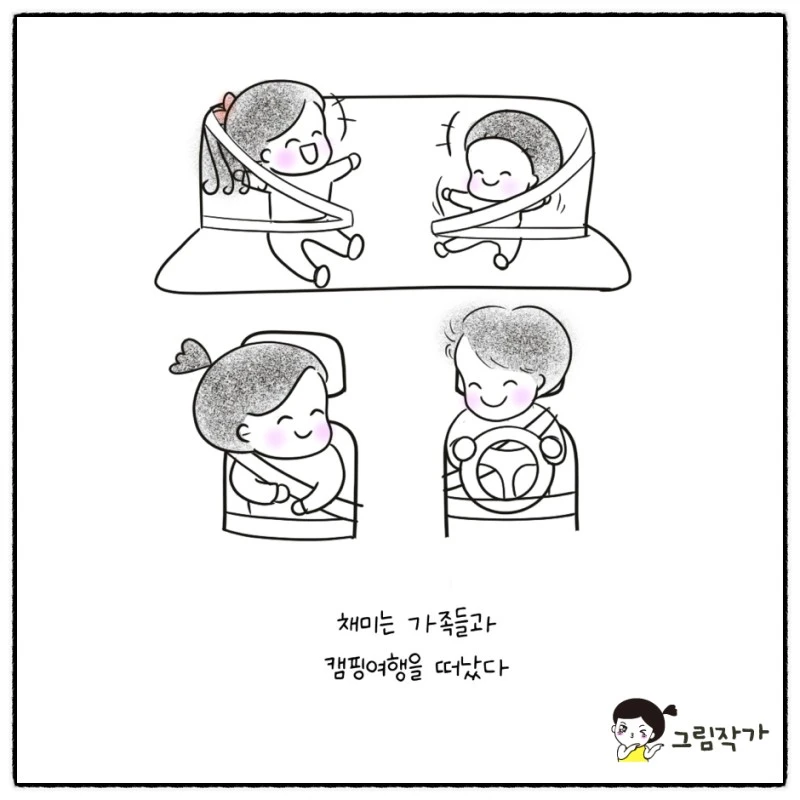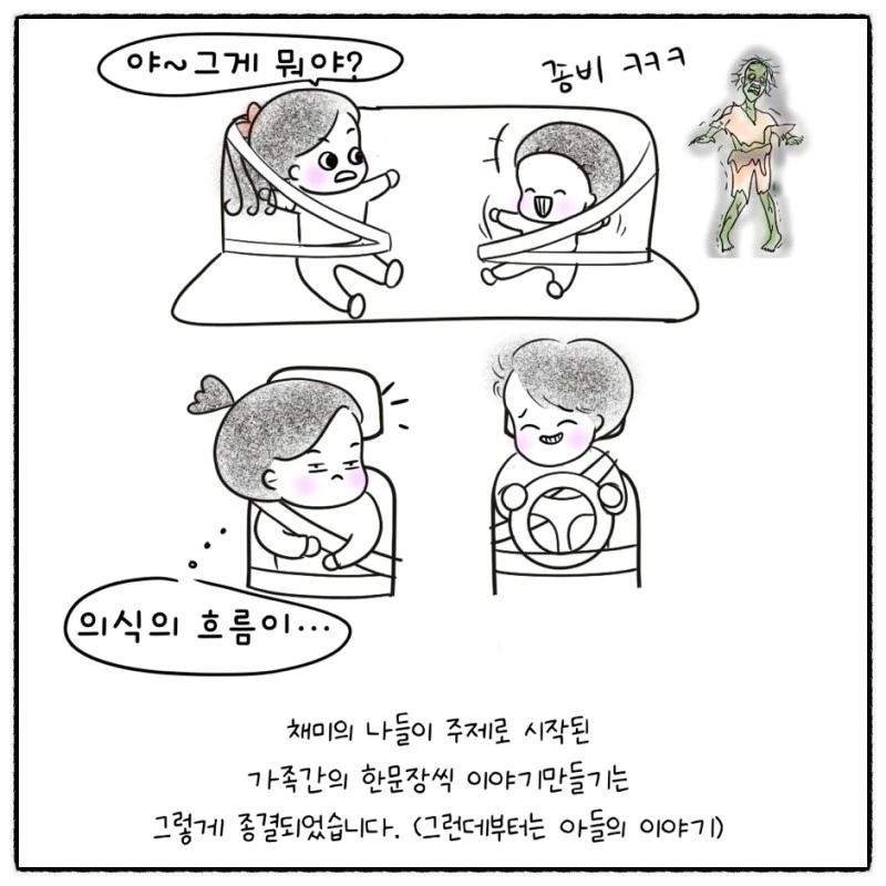 이번에는 아이들과 한줄씩 문장을 만들어 이야기 만들기를 하기로 했어요. 딸이 채미의 나들이로 주제를 정해주고 엄마, 딸, 아빠 순서로 문장을 만들고 나니