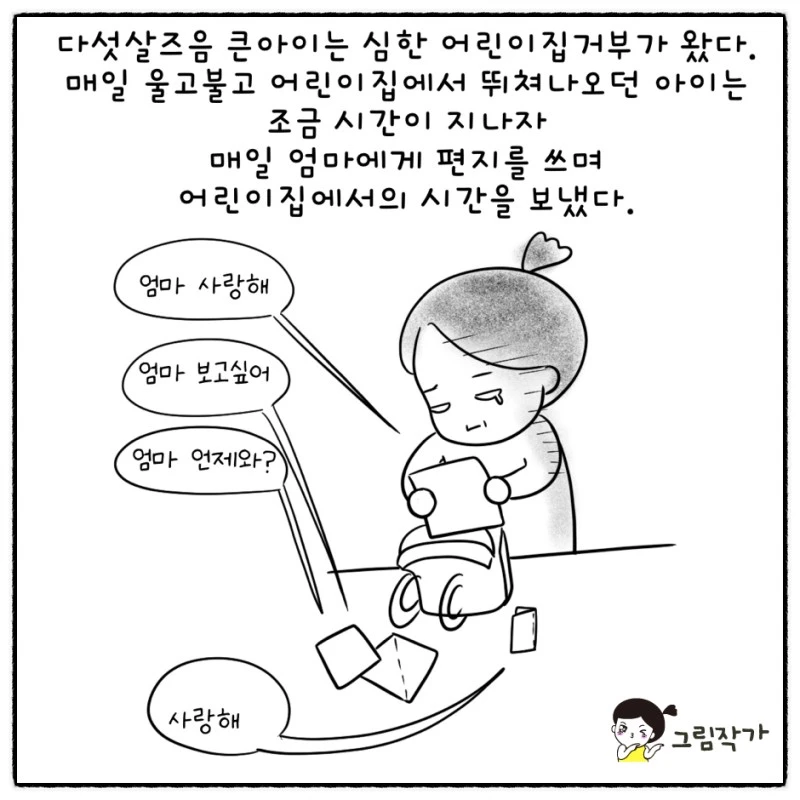 아이는 어린이집에서 심심할때마다 엄마에게 언제와 빨리와 사랑해 하며 한줄짜리 편지를 썼어요. 어린이집 가방엔 늘 편지가 있었습니다.