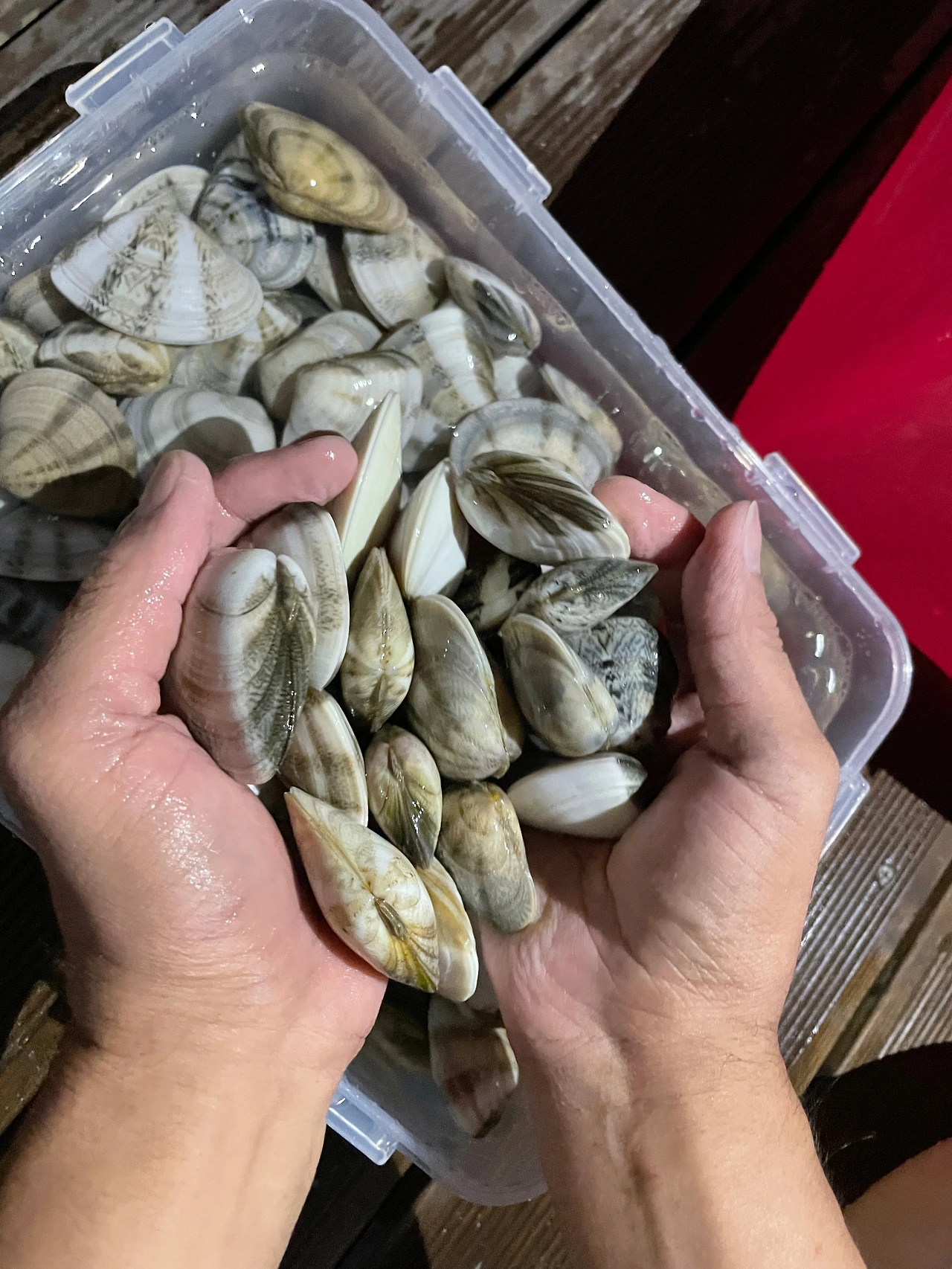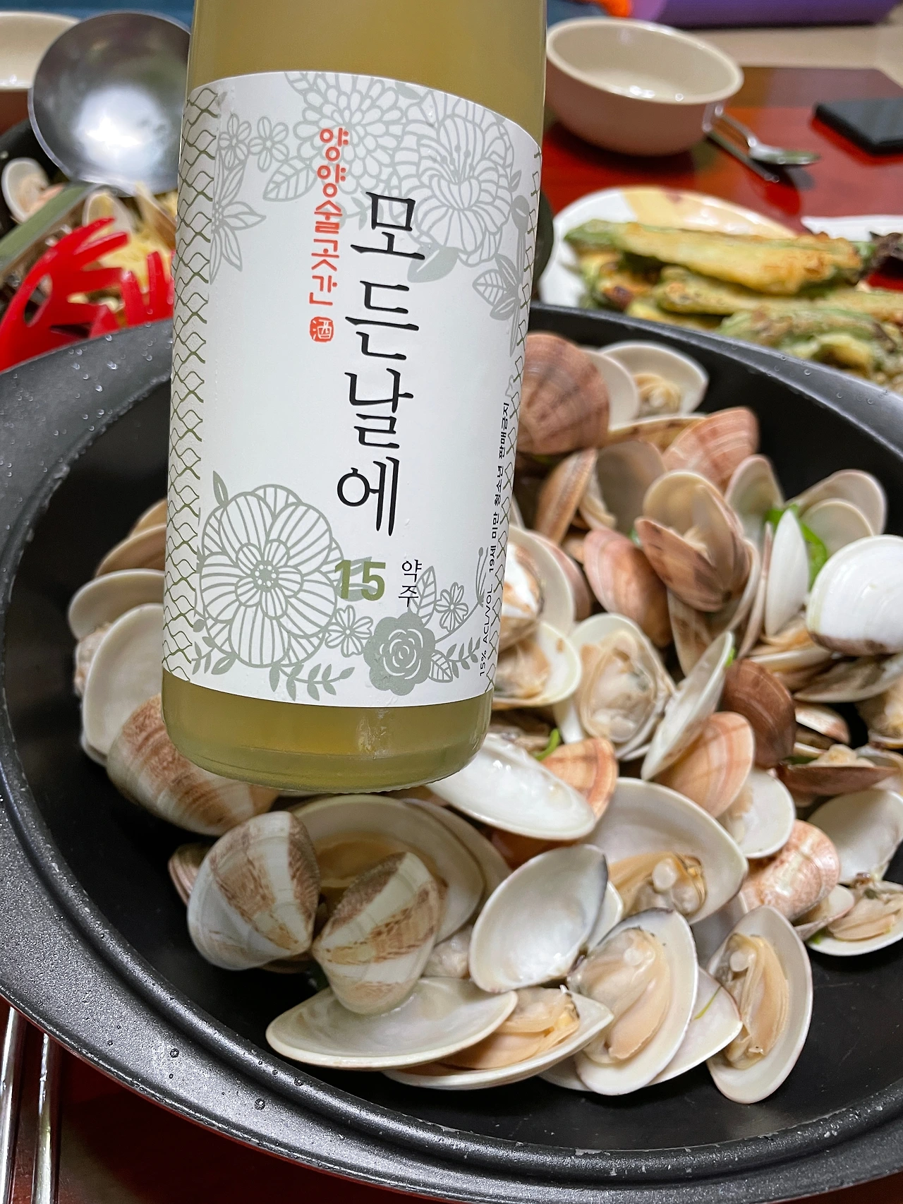 3. 째복 잡기. 째복은 강원도에만 자라는 비단조개의 일종인데, 바지락과 비교가 안되게 살이 크고 쫄깃하다. 비린 맛도 덜하다. 한마디로 최고의 조개! 태닝을 하다가 덥다면 바닷속으로 들어간다. 준비물은 나의 두 발가락과 양파망. 발가락으로 헤집으면 조개가족이 모여있다. 한 가족을 모조리 잡아가는 것이 미안하긴 하지만 보통 조개가 모여있어서 한 무더기씩 잡으면 다음 날 저녁은 금세 해결된다.