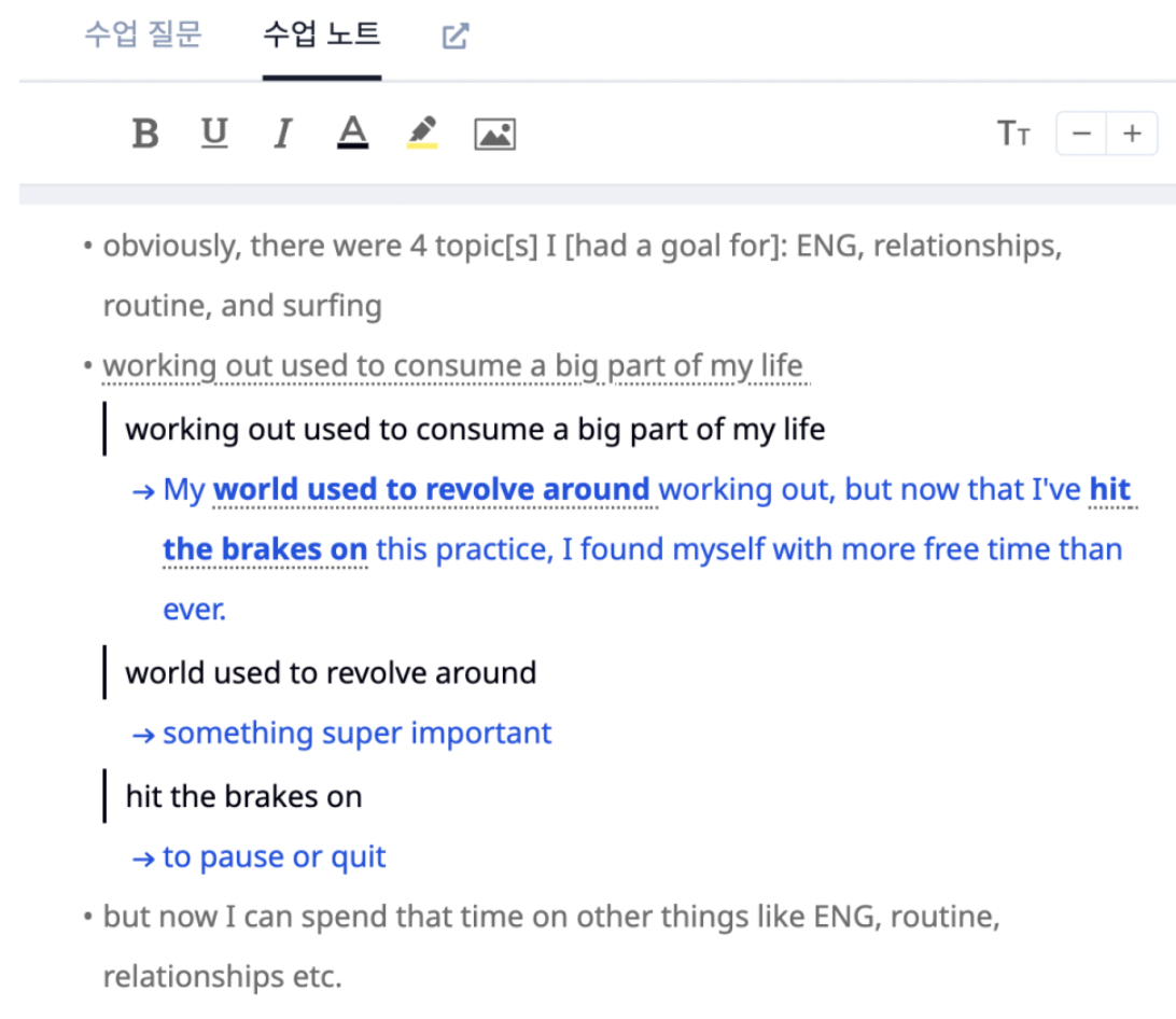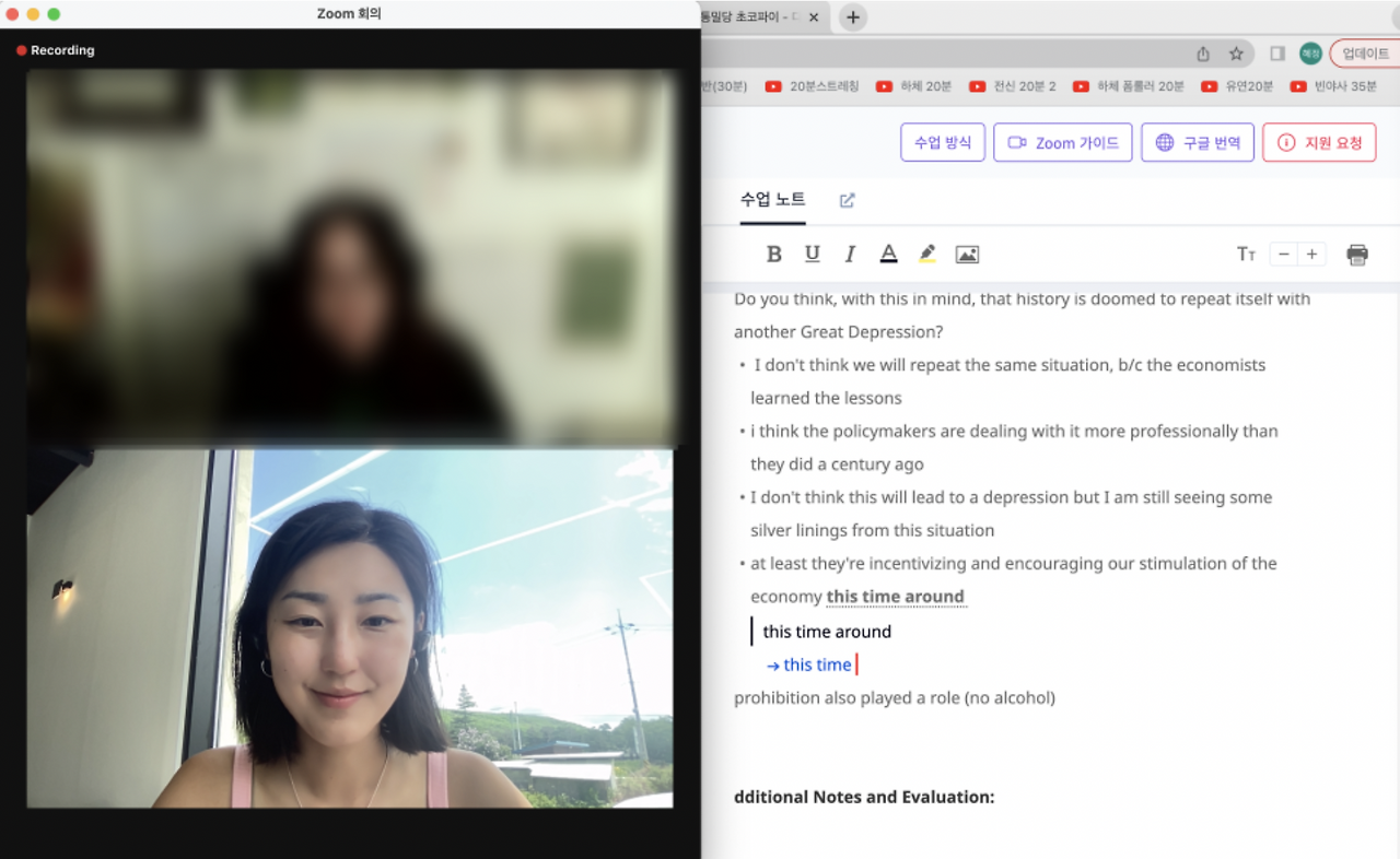 미리 토픽을 골라 읽고 질문 세 개에 대한 답변을 준비하면, 그것에 대해 줌으로 수업하며 얘기한다. 수업 시작 전에 진행방식을 요청할 수 있다. 사람 따라 다를 것 같긴 한데, 내 목표는 자연스럽게 말하는 것이기 때문에 나는 패러프레이징을 중심으로 수업을 한다. 40분의 수업 중 보통 10-20분 정도는 아이스브레이킹으로 근황, 일상에 대한 얘기를 하고 나머지 시간 동안에는 그 날의 토픽에 대한 답변을 내가 말 한다. 나는 왼쪽에는 줌을 띄워놓고 오른쪽에는 강의노트를 보면서 하는데, 보통 실시간으로 내가 말 하는 것들은 강사는 받아적어서 바로바로 패러프레이징해주고, 놓친 것은 피드백에 더 넣어서 전달해 준다. 이 과정에서 실제로 많이 쓰는 이디엄도 많이 알 수 있고 대신 사용할 수 있는 더 유용한 단어를 알려주기도 한다.