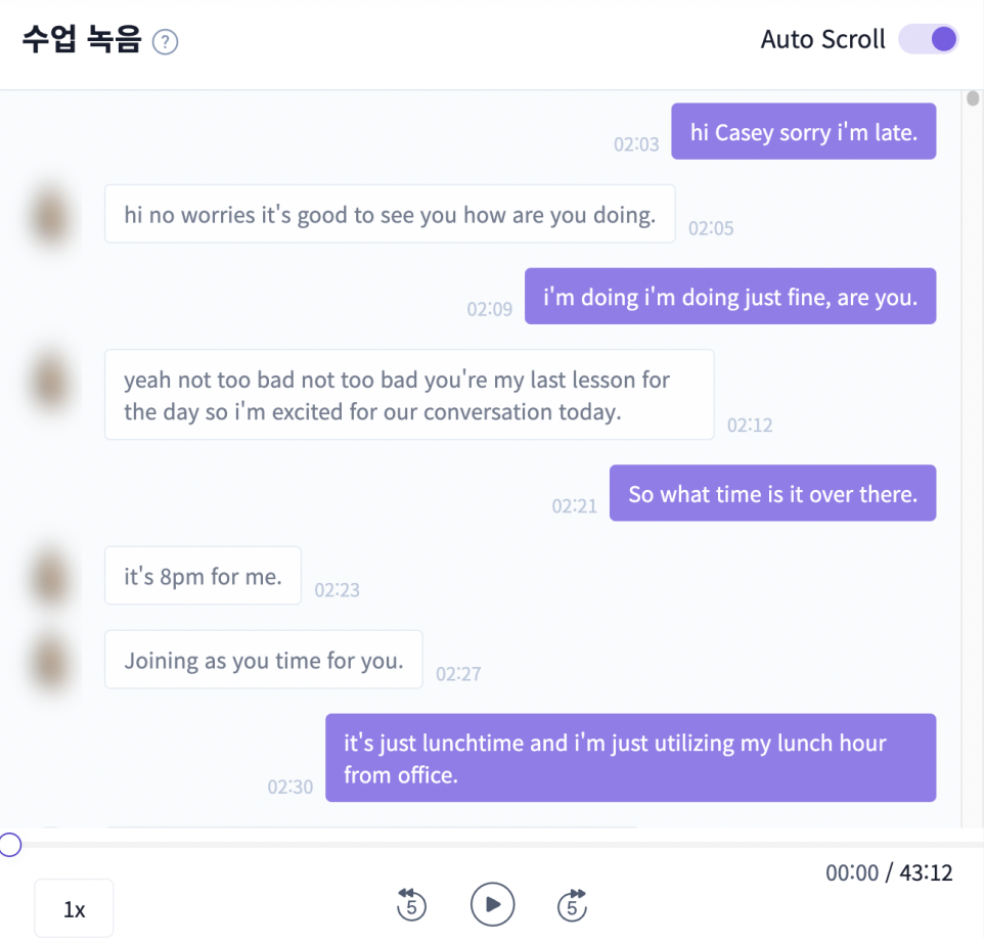 녹음파일을 들으면 내가 어떻게 말했는 지, 튜터가 어떻게 교정했는 지 명확하게 알 수 있다. 이게 나는 가장가장 중요한 부분이라고 생각한다. 보통 내가 말하는 것을 다시 들을 기회가 없는데, 이를 직접 들으면 내 상상과 실제가 얼마나 달랐는 지 알 수 있다^^. 어떤 부분에서 버벅댔는 지를 알 수 있고, 무엇보다 내 나쁜 습관들도 알 수 있다. 처음엔 내가 말한 걸 듣기가 민망하고 싫어서 안 들었었는데, 뭔가 복습이 제대로 안 되는 느낌이라 듣기 시작했는데, 기존에 안 들었던 것을 후회한다. 그렇지만 여전히 약간 부끄러워서 1.25배속~1.5배속 정도 해서 듣는다. 시간이 조금 걸리기는 하지만 정말 가장 가장 중요한 부분이라고 생각해서 최근에는 가능하면 꼭 들으려고 하고 있다.