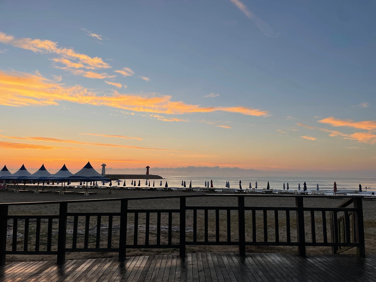 아직 밖은 캄캄한데 새가 짹짹거리는 소리가 들린다. 어렴풋이 습기를 머금은 풀의 냄새를 느끼며 숨을 후웁 들이쉰다. 냄새가 좋다. 숨을 들이쉬고는 물치로 향했다. 아직 잠이 덜 깼지만 서핑하면서 배가 고프지 않으려면 먹는 게 좋으니까 햄버거를 우물우물 먹는다. 가는 길에 해가 뜨기 시작한다. 어둠속에서 점점 밝아지는 분홍빛 하늘은 언제나 경이롭다.