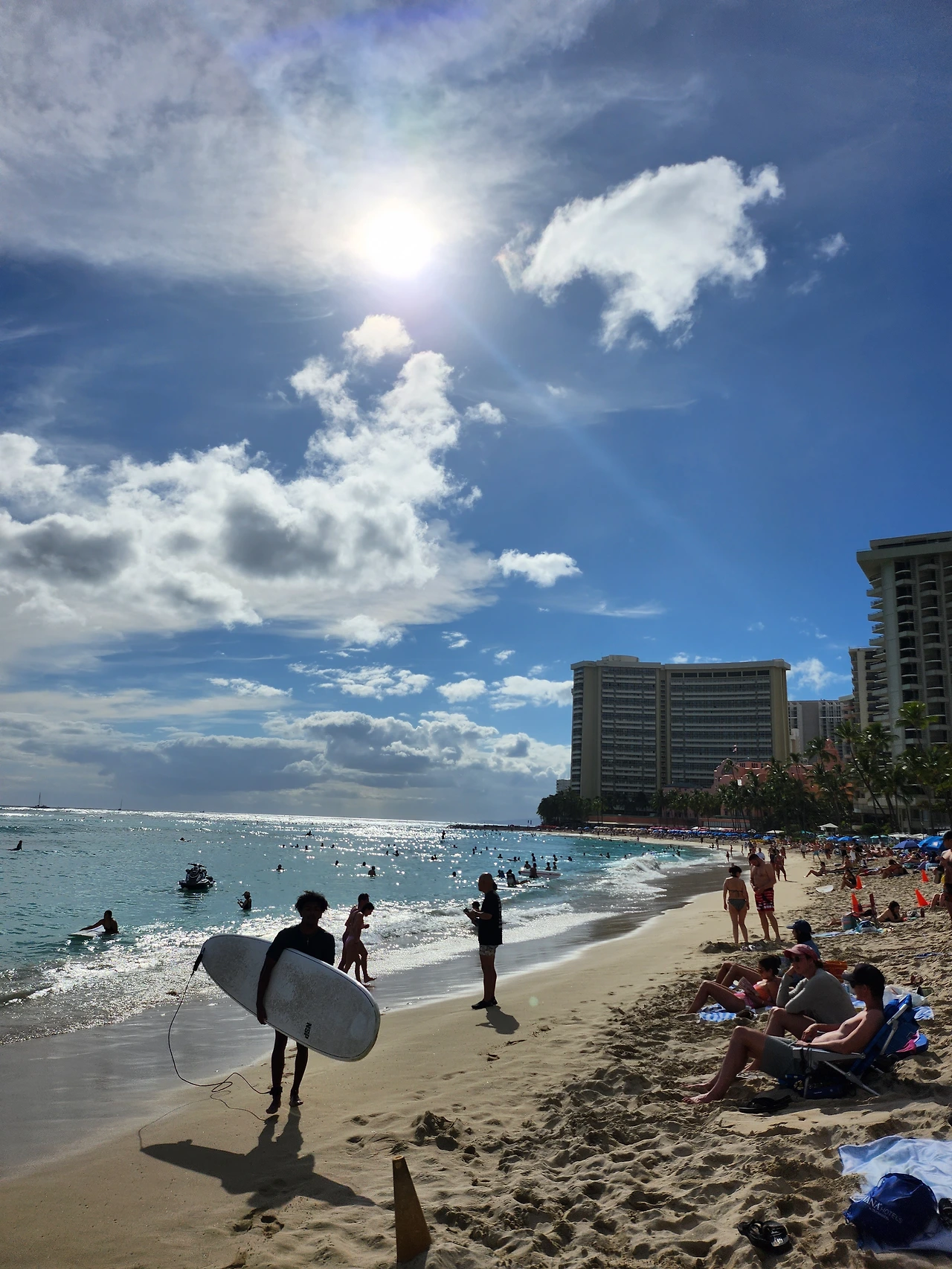 바다 더 멀리에는 파도를 타는 사람들이 보드 위에 앉아 있었다. 이럴 수가, 이렇게 좋은 파도가 이렇게 가까이 있다니. 보통은 사람들이 많이 있는 비치는 잔잔하고 서핑 스폿은 파도가 거칠거나 리프가 있어서 공존하기가 힘든데 이곳은 유명한 비치에서 바로 서핑을 즐길 수가 있었다. 와이키키에서 서핑을 할 수 있다고는 들었지만 이렇게 가까이 었을 줄이야, 무엇보다 파도가 이렇게 좋을 줄이야. 너무너무 신이 났다. 무려 6개월 만에 보는 파도였다. 당장 들어가고 싶었지만 내일 새벽을 기약하며 자리를 떠났다.