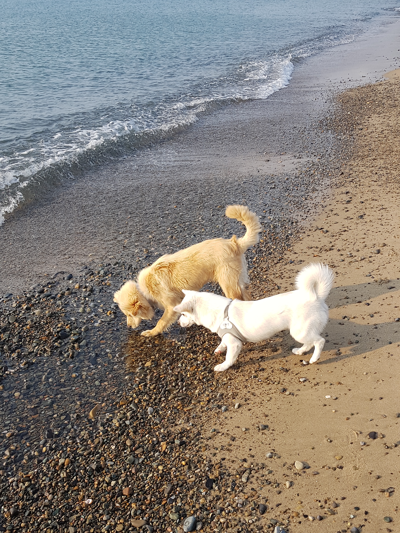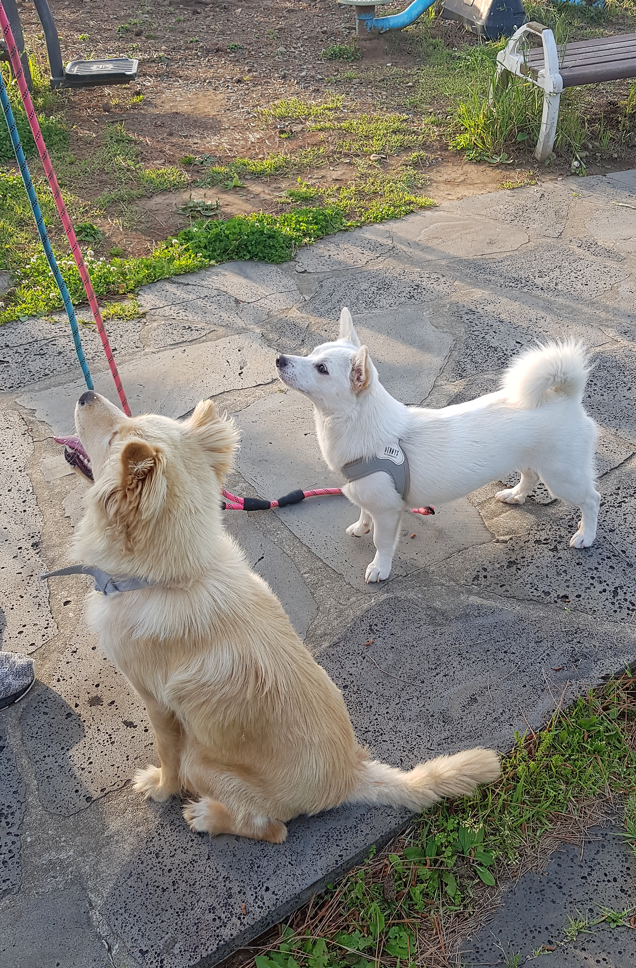 하와이에서의 매일 하루의 마무리는 엄마와 담담이의 일과와 사진을 얘기하는 것으로 마무리했다. 엄마는 고맙게도 담담이 찍사를 자처해서 매일 바지런히 담담이 사진을 찍어날라 주었다. 사진 속 담담이는 점점 더 밝고 행복해 보였다. 적응을 한 게 분명했다. 담담이의 일상은 누구보다 바빠서 지루할 틈이 없어 보였다. 새벽마다 아빠와 공원으로 해변으로 쏘다니며 산책을 했다. 그렇게 한 시간 반에서 두 시간씩 산책을 하고 나면 오전 내내 지쳐서 잠을 잤다. 오후에 엄마와 잠시 놀거나 동네 마실을 가고 저녁에 동생과 산책을 가고 나면 다시 잠을 자고. 다행히 우유와도 잘 지낸다고 했다. 동갑내기 견생 10개월 차 강아지들. 둘이서 조그만 강아지 집에서 같이 잠도 자고 밥도 같이 먹고 틈만 나면 같이 논다. 순딩이 우유가 담담이가 적응하게 도와주었나 보다. 밥도 잘 먹고 응아도 우리 집에 있을 때보다 더 많이 한다.