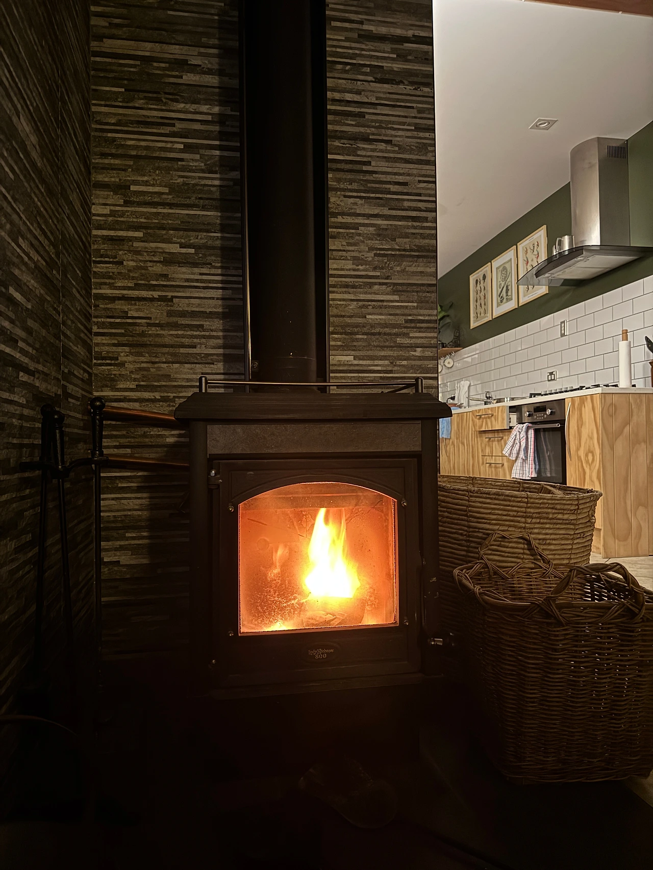 한가로이 시간을 보내니 어느 새 날이 어두워지고 공기가 차다. 이 때를 기다렸다. 벽난로 앞에 앉아서 불을 피워보기로 했다. 호스트가 상세히 적어둔 가이드에 따라서 불을 피워보았다. 착화제 위에 얇은 장작에 공기가 통하게 두고 성냥을 그어 불을 피운 후 문을 닫고 기다린다. 이후 나무에 불이 붙으면 큰 장작덩어리를 넣고 덩어리까지 불이 옮겨붙으면 불피우기 완성이다. 하지만 캠핑에서 해보던 것과 달리 잘 붙지 않아 헤매었다. 불을 피우다가 꺼트리다가를 반복하며 따뜻해지다가 말아버리는 거실에 그만 주저앉아 와인을 마시며 도란도란 이야기를 나누다가 어느새 깊어진 밤에 잠이 들었다.