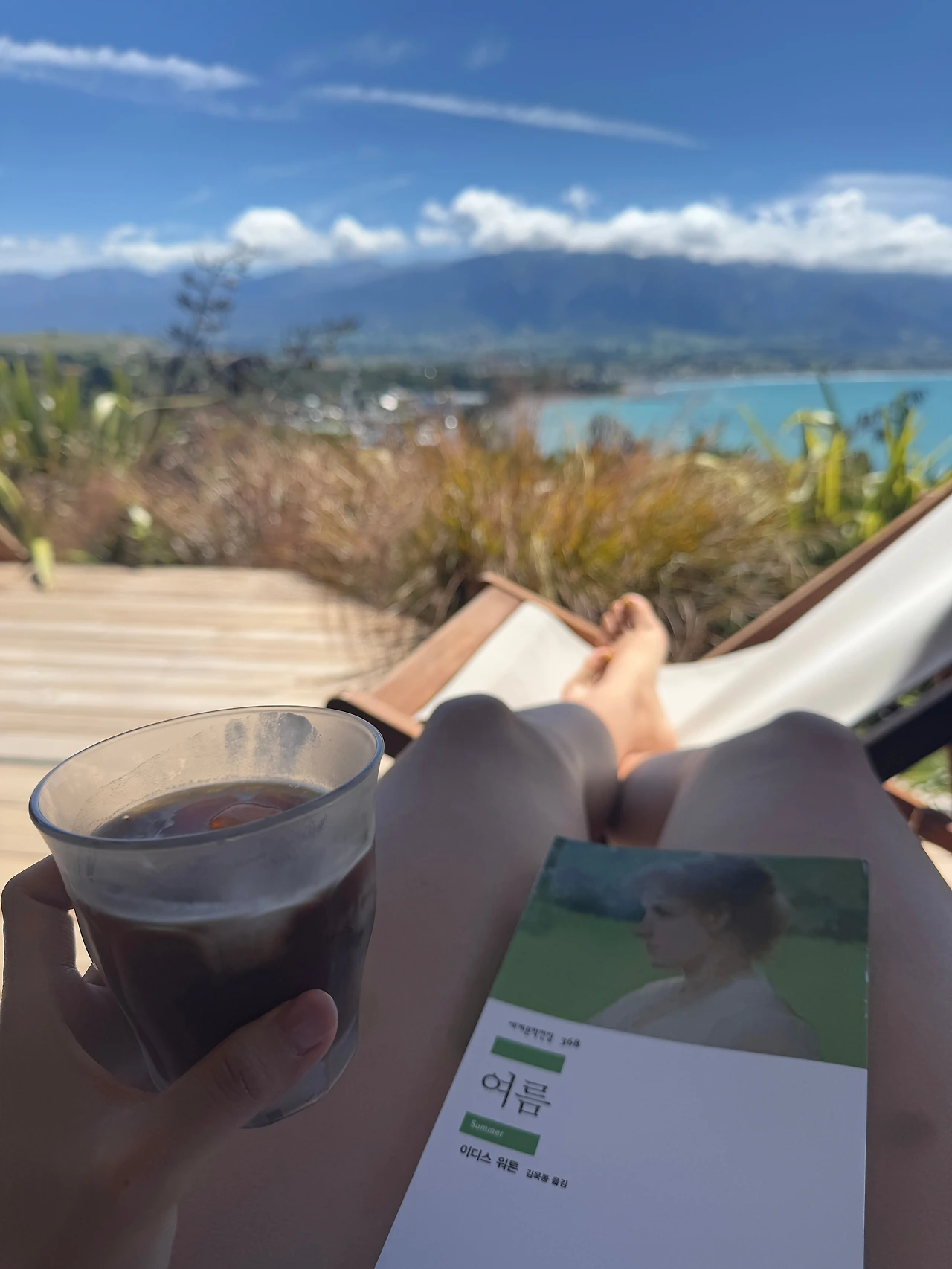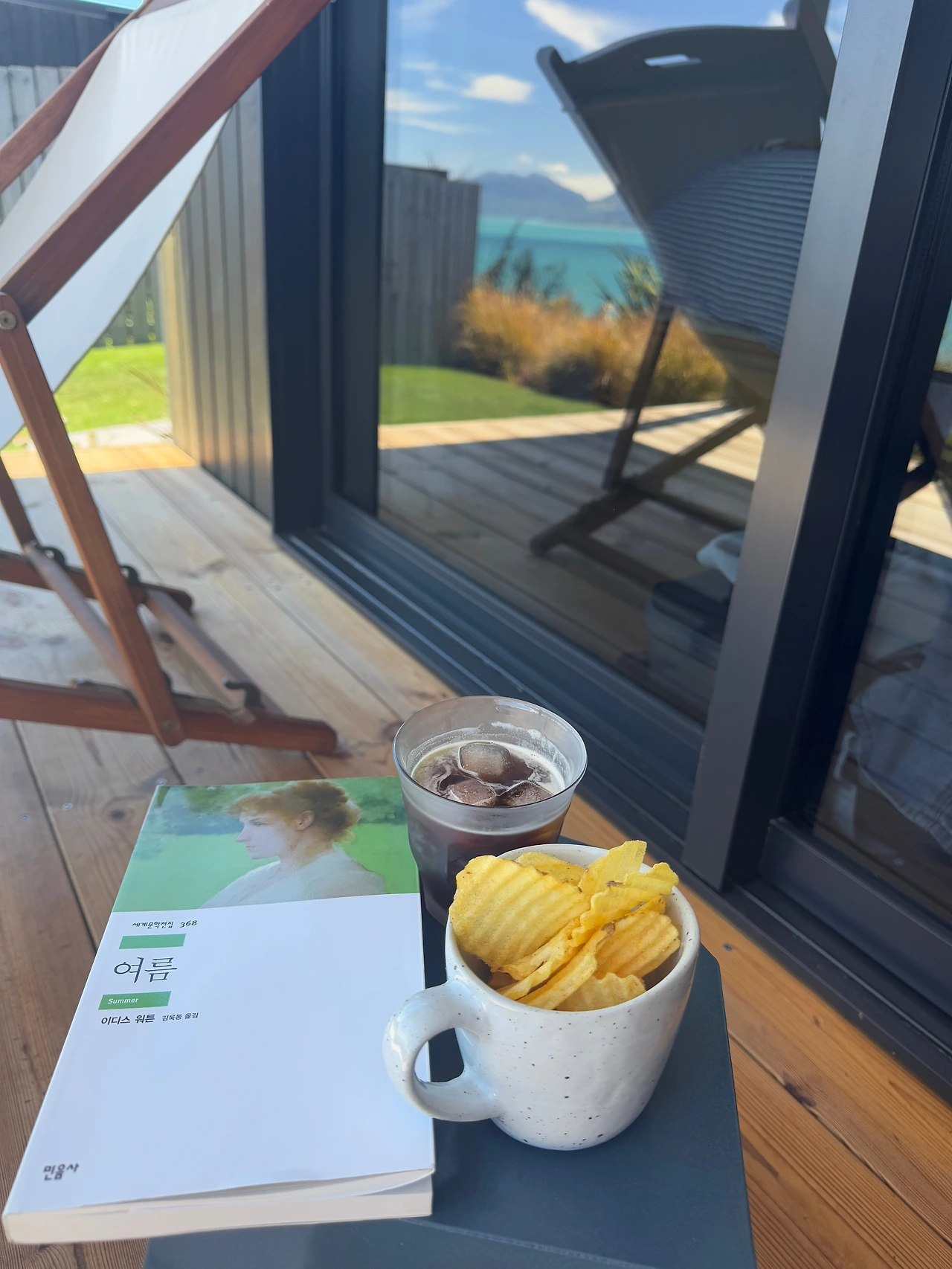 커피를 한 잔 내려 테라스로 나왔다. 이디스 워튼의 여름이라는 책을 펼쳤다. 아름다운 연초록 자연을 풍부하게 묘사한 책으로 지금 이 순간과 멋들어지게 잘 어울렸다. 이렇게 행복할 수 있을까! 책을 보다가 다시 들어가서 잠시 잠을 자고 일어났더니 남편이 카약을 타러 가자고 한다. 퀸스타운에서부터 타고 싶다던 그의 소원을 드디어 성취하는구나 싶었다. 심지어 100% 물개 만남 보장이었다.