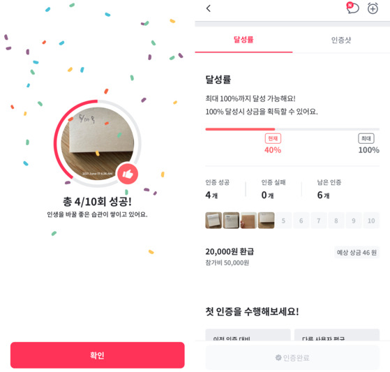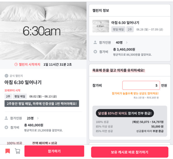 도전하고 싶은 챌린지를 정하고 ‘참여하기’ 버튼을 클릭하면 참가비를 거는 화면으로 넘어갑니다. 결제는 신용카드나 카카오페이로 할 수 있어요. 신청이 완료되면 챌린지가 시작하는 전날 알림이 와요. 그럼 정해진 시간에 미션을 수행하고 완료 사진을 찍어 올려 인증받으면 됩니다. 참가비 환불은 2주간의 챌린지가 끝나는 날의 다음 날 정오에 결과에 따라 정산해 해줍니다. 챌린지에 성공했을 때는 결제금 전액이 취소되고, 챌린지 100% 달성시 받을 수 있는 상금은 포인트로 쌓입니다. 챌린지에 실패해 벌금을 낼 때는 벌금을 제외한 금액이 결제 취소됩니다.