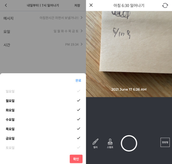 그중에서도 가장 좋은 점은 다양성이에요. 챌린지 종류가 많고 또 사용하는 중에도 계속 늘어나요. 트렌드에 뒤처지지 않도록 해주는 챌린지도 많아요. 한 가지 예로 유튜브에서 유명한 크리에이터의 ‘홈트 따라하기’ 챌린지가 계속 생기고 있어요. 내 경우 아침에 10분 정도 유튜브를 보며 스트레칭을 하고 집을 나서는데, 홈트 유튜버인 ‘미서원’의 골반교정 스트레칭을 주로 해요. 그런데 어느 날 앱을 들어가 보니 이미 이 챌린지가 진행되고 있더라고요. ‘챌린저스가 정말 빠르게 움직이는구나’라고 생각했던 기억이 있어요. 챌린저스에서 가장 많이 알려진 ‘기상 챌린지’도 6시 30분·7시·7시 30분처럼 30분 단위로 촘촘하게 있어요. 만약 필요한 챌린지가 없을 땐 직접 만들어 진행할 수도 있어요.