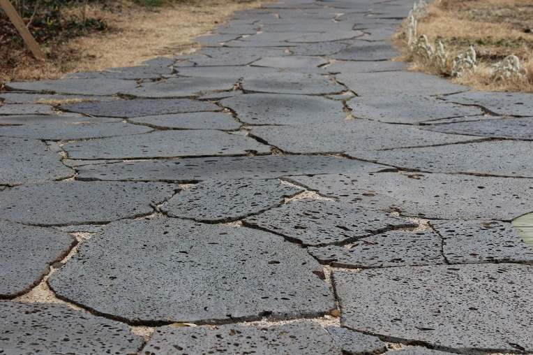 현무암은 화산석 또는 제주석이라고 하는데, 제주도에서 볼 수 있는 구멍이 뽕뽕 뚫린 돌을 말한다. 포장재로 쓰면 독특한 분위기를 낼 수 있다. 아래 사진은 화산석이 불규칙하게 잘려 배치되는 부정형 포장이다. (마찬가지로 정형도 가능하다.)
