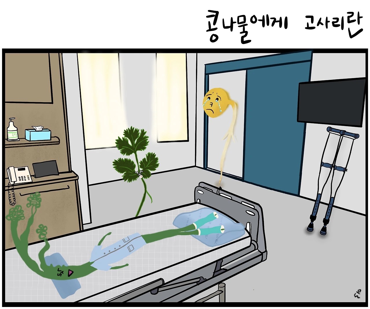 입원을 한 것은 고사리인데 죽을 듯이 우는 것은 콩나물이고 위로하는 것은 고사리예요.