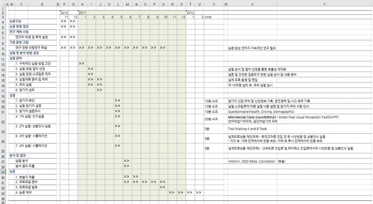 전체적인 연구 흐름과 실험과제 추진까지 담을 수 있다. 그리고 아래 기간을 보면 알겠지만 월별로 표기해 두었기 때문에 이하 하부 계획은 필요하다면 일별로 수정이 가능하다. 나의 경우는 필요한 화살표를 클릭하면 해당 상세 월별 계획표가 연결되도록 만들었다.