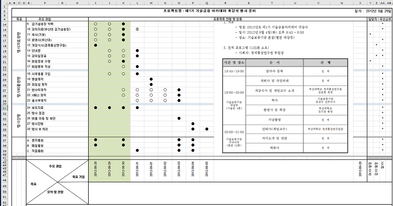 다음 두 번째 그림은 아카데미 개강식 행사를 위해서 준비할 것들과 업무 진척사항을 보여준다. 그리고 아까 말한 것처럼 주요 행사 내용을 담고 있으며, 마지막으로 담당자 우선순위를 표기해 둔다.