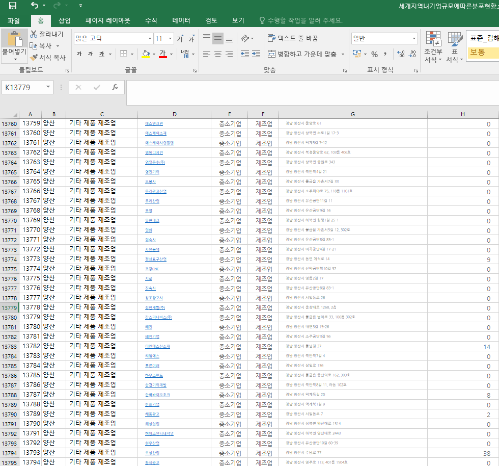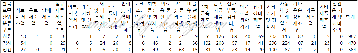 경남 세 개 지역 내에 소재한 중소기업의 온라인 브랜드 자산을 연구하기 위해서 맨 먼저 한 것은 얼마나 많은 제조업이 존재하는지를 알아야 했다. 사실상 기업은 하루가 멀다 하고 개업을 하기도 폐업을 하기도 한다. 그래서 실데이터를 구하는 데는 한계가 존재한다. 그래서 일반적으로 2017년, 2018년과 같이 특정 연도를 중심으로 정해진 데이터를 수집해야 한다.
