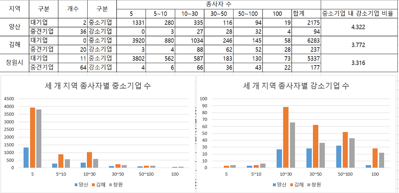 표에서 알 수 있듯이 전반적인 기업 유형에 따른 기업 분포수를 확인할 수 있었으며, 세 개 지역 내 종사자별 중소기업 수와 중소기업 내 강소기업의 수를 고찰할 수 있었다. 특히 중소기업 내 강소기업 비율이 높은 지역은 양산이었다. 아울러 세 지역 모두 5인 미만 중소기업이 가장 많았으며, 강소기업은 10인 이상에서 30인 이하에 많이 포함됨을 알 수 있다. 특히 김해의 경우 강소기업 수가 매우 높다는 것을 알 수 있다.