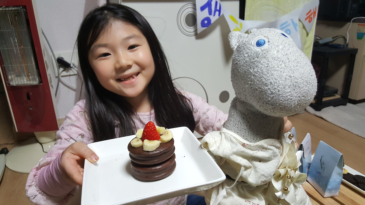 딸아이는 준비한 초코파이 케이크에 딸기와 바나나를 토핑처럼 올려서 이단 케이크를 만들어 무민의 생일 파티 분위기를 올렸다. 오늘 생일 파티 초대 손님은 나의 딸과 아빠인 나, 그리고 무민의 친구인 인형 친구들이다.