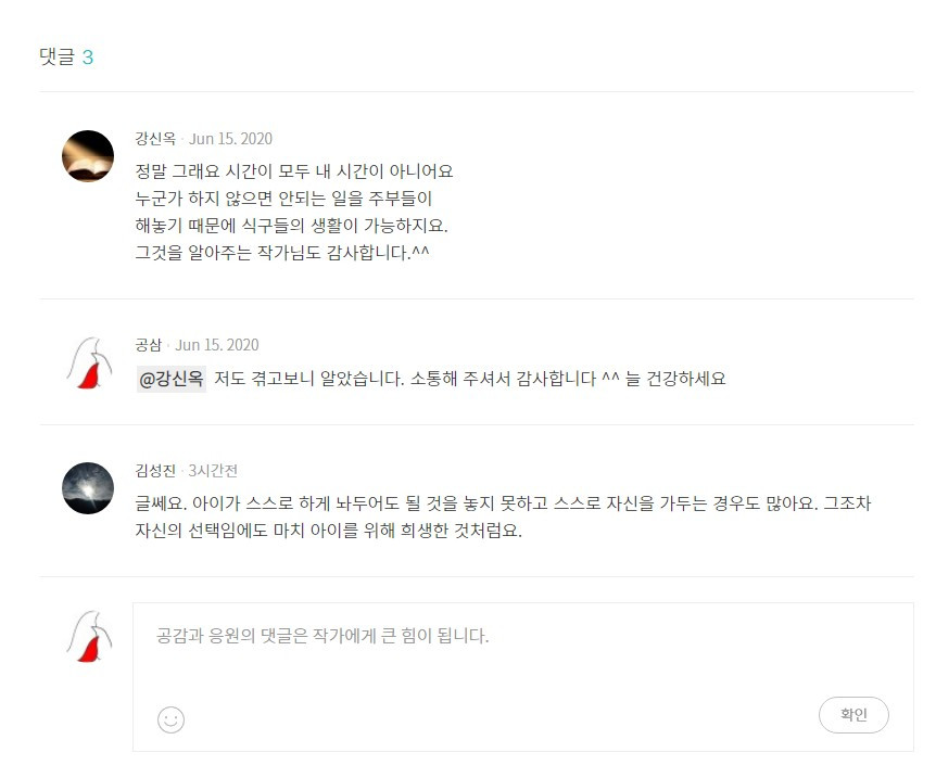 안 그래도 내가 글을 쓰고 카스와 페북에 공유를 했더니 여러 사람들이 당장에 가정 주부를 때려치우라는 말이 대부분이었는데, 오늘 2시간 전에 가정주부는 자신의 선택이며, 아이를 핑계로 시간이 없다는 말은 결국엔 위선이라는 식의 뉘앙스로 댓글이 적혀 있었다. 그 댓글을 보고 많은 생각이 오갔다.