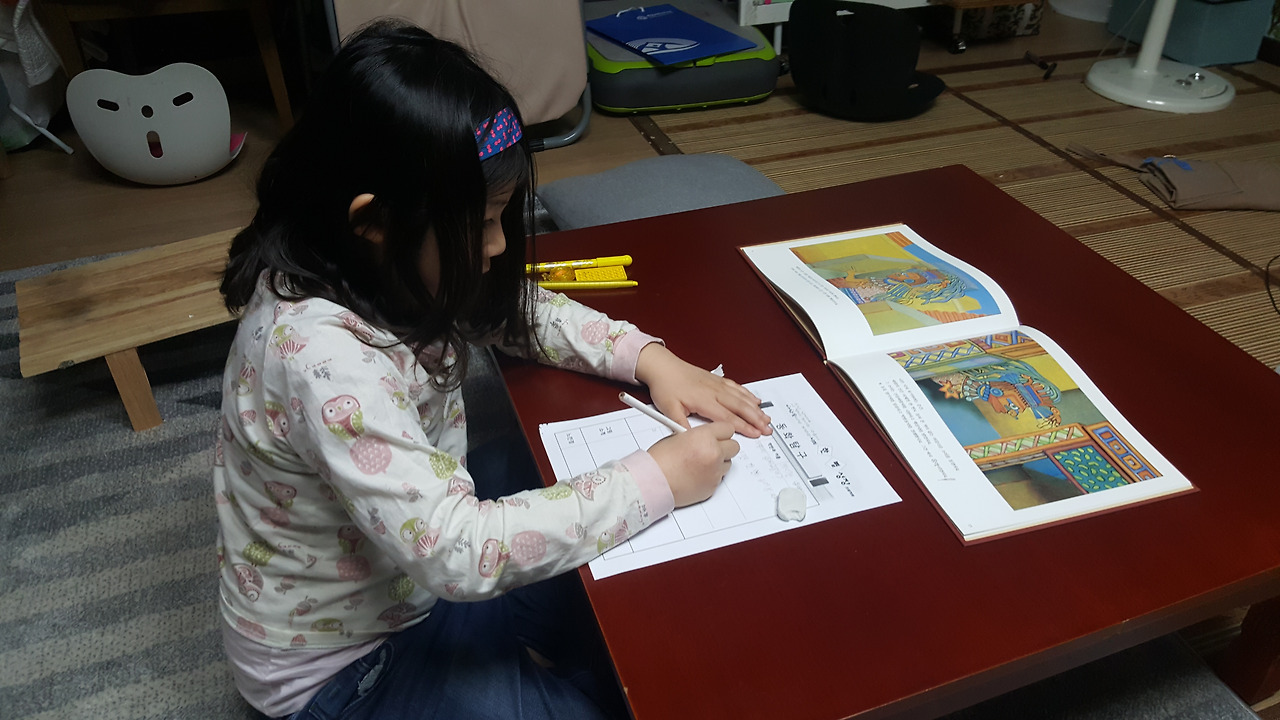 8살 어린이라서 인내력이 부족할 것이다 생각하여 한 문장을 세 번씩 쓰도록 지시했습니다.
