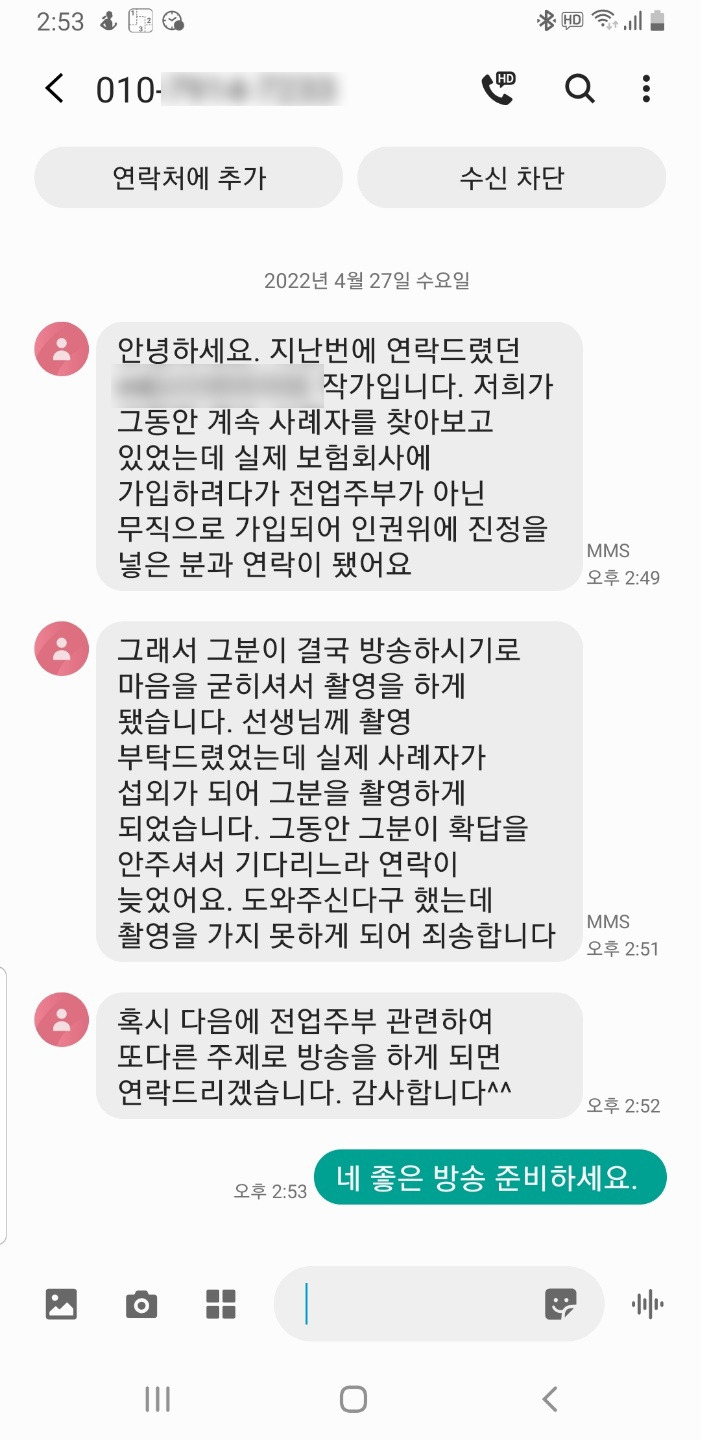 방송사에서 준비하는 전업주부에 대한 인터뷰 내용은 인권위에 관련된 내용으로 다소 민감한 문제처럼 보였다. 요지는 남성이 전업주부라면 무직으로 분류가 되어 보험 가입할 때 차별을 받는다는 내용이다.